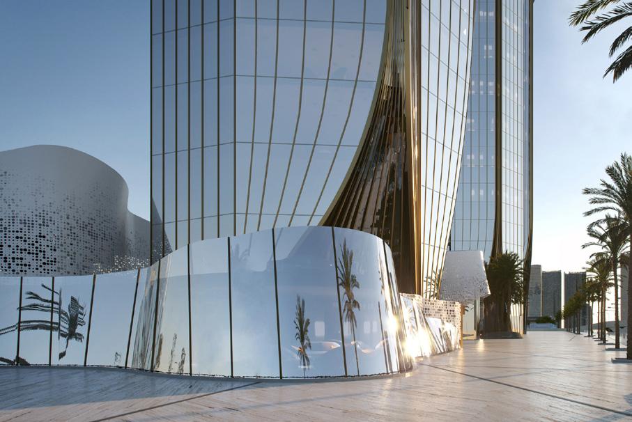 The geometry of the buildings presents a refined interpretation of the regional vernacular and the natural forms of sand dunes, expressed through a fluid architectural language of a partially undulating facade mimicking the land contours and the domes of mosques. The towers’ sinuous facades feature an interplay of colors with contrasting hues. The main facade element consists of clear panels interspersed with coppery panels that form an inwardly concave arc. The curvilinear shape prominently forms at the towers’ lower floors, where the curved form creates slightly different plans on each level. Their glass facades feature smooth, reflective surfaces thoughtfully designed to withstand and perform in the dusty desert environment of Abu Dhabi.