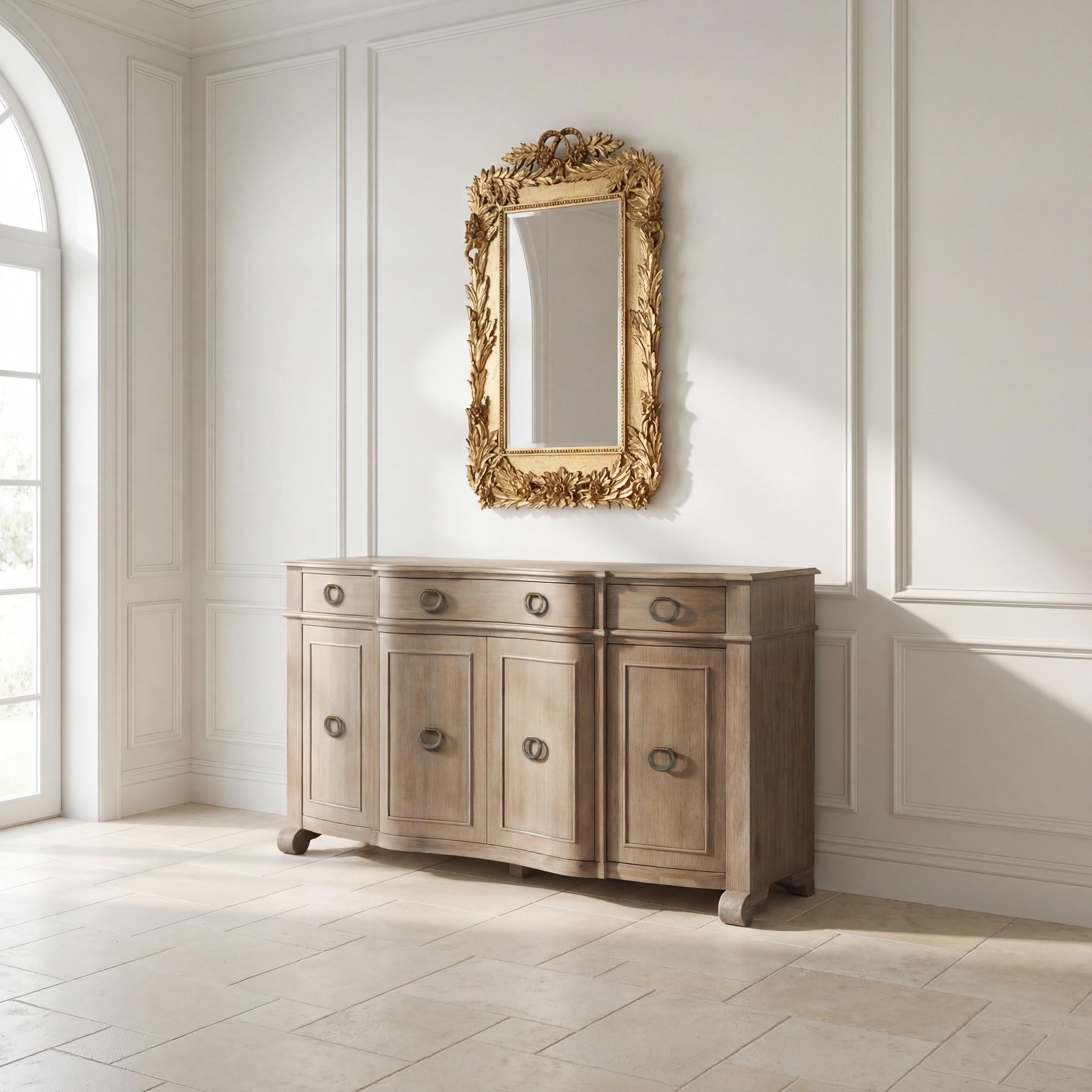 Left: Great House Sideboard, Driftwood: F-010-2-145-002; Laurelcrest Mirror, Soft Gold: EWI25592