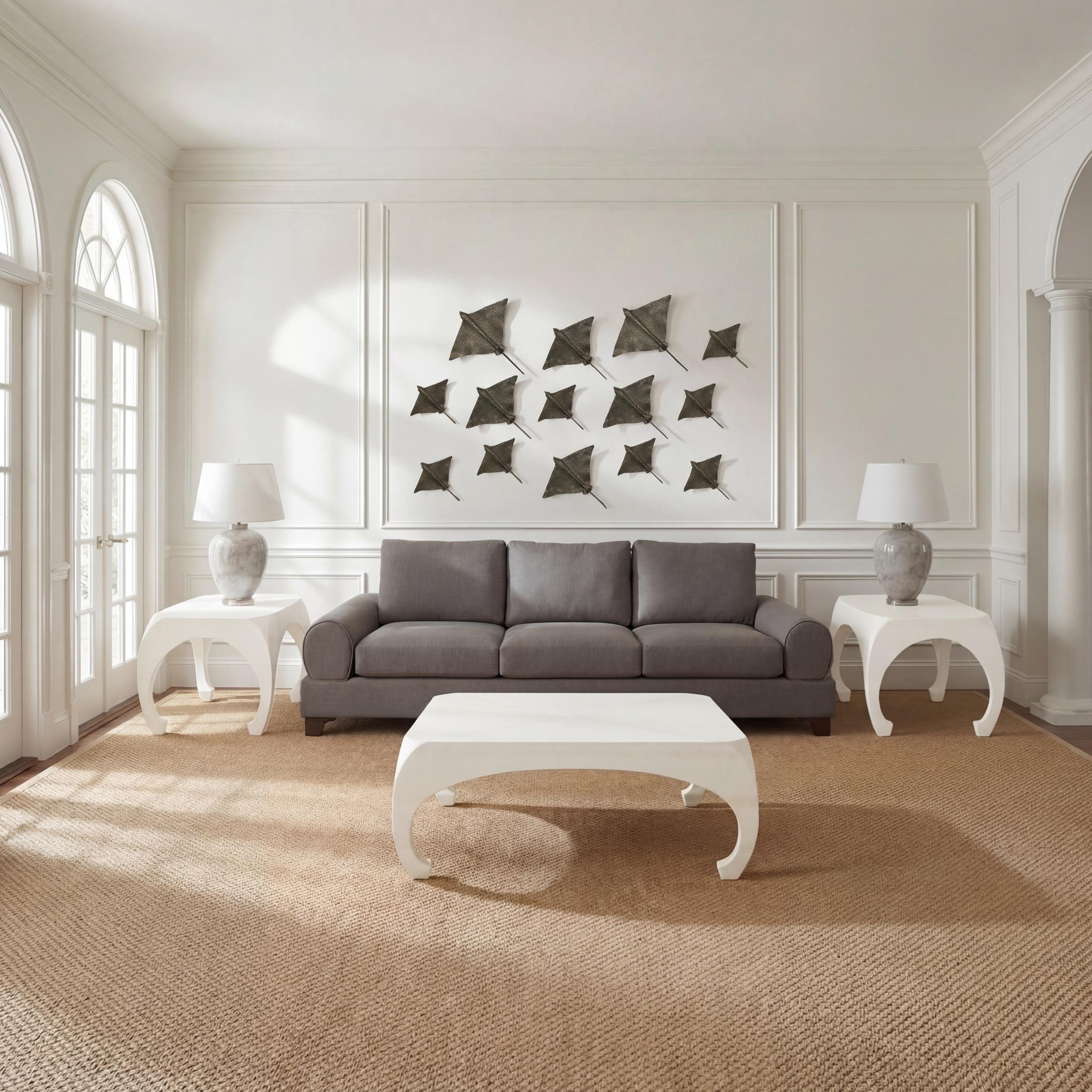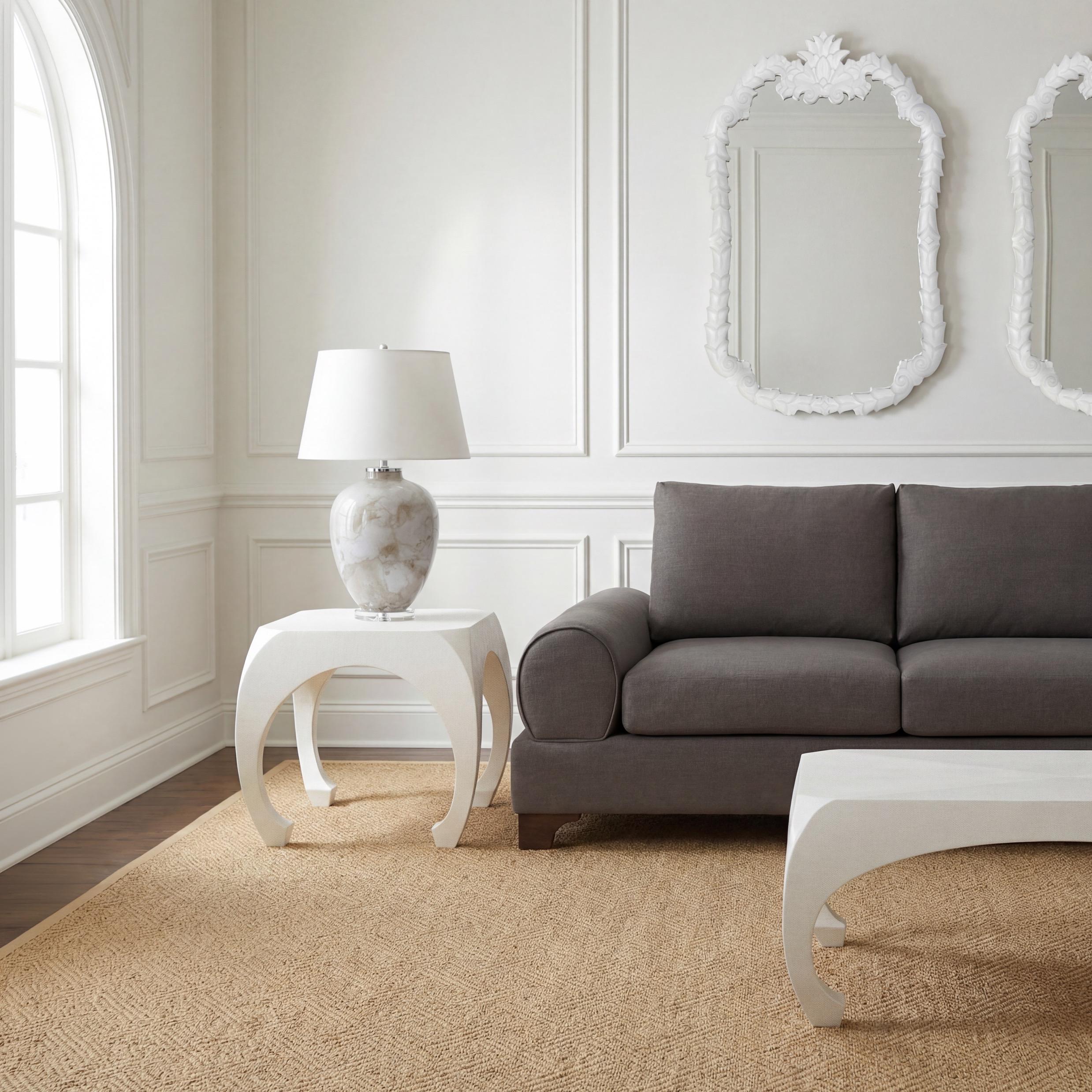 Following Two Pages: Blue Marble ELT25187-B; Hibiscus Buffet, Silk Linen: F-169-2-145-12B; Savoy Mirror, Classic White: EWI25598; Nebula Table Lamp, Warm Grey Marble: ELT25188-B