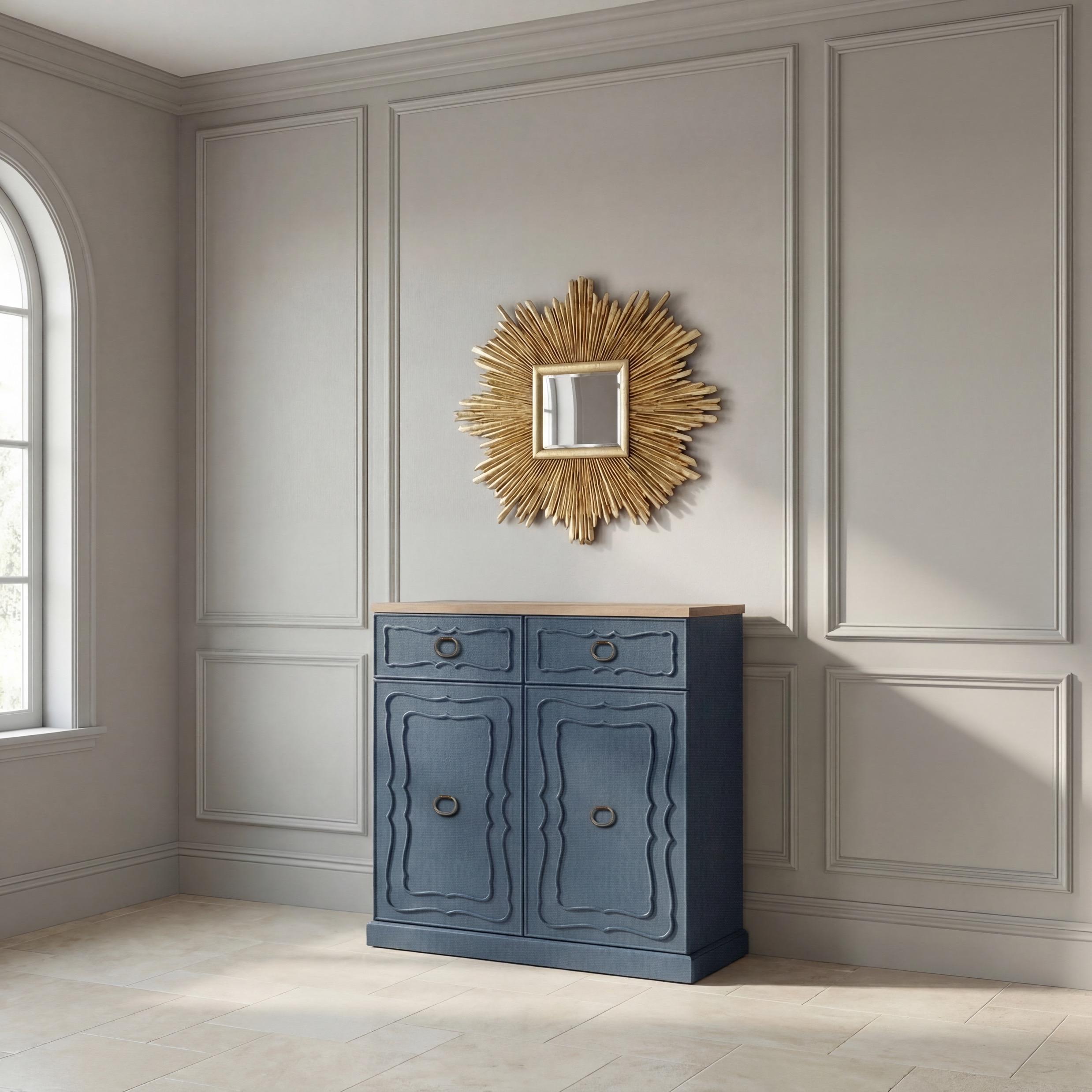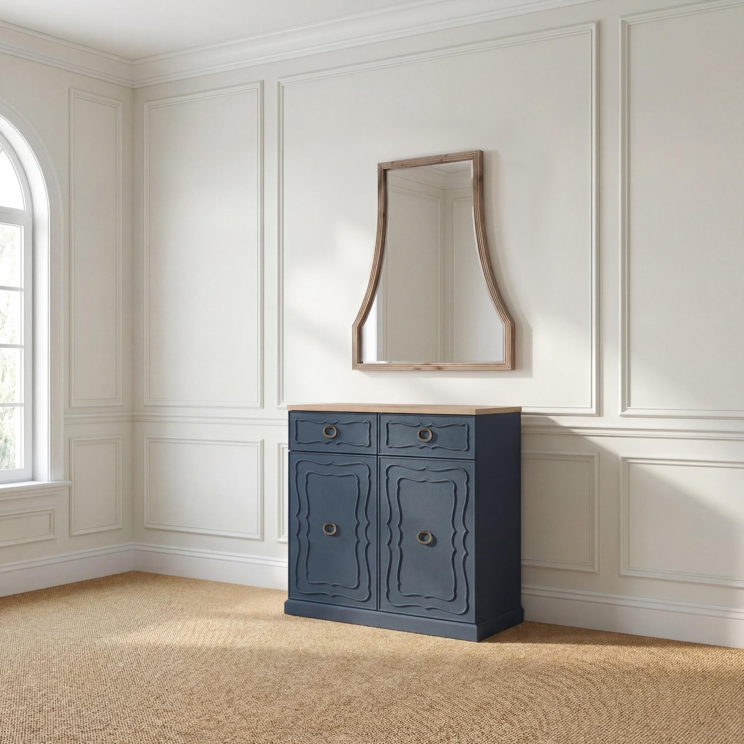 Left: Hibiscus Hall Chest, Indigo: F-156-3-155-09B; Great House Hall Mirror, Driftwood: F-010-3-121-002
