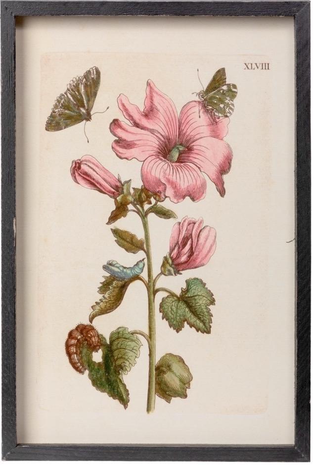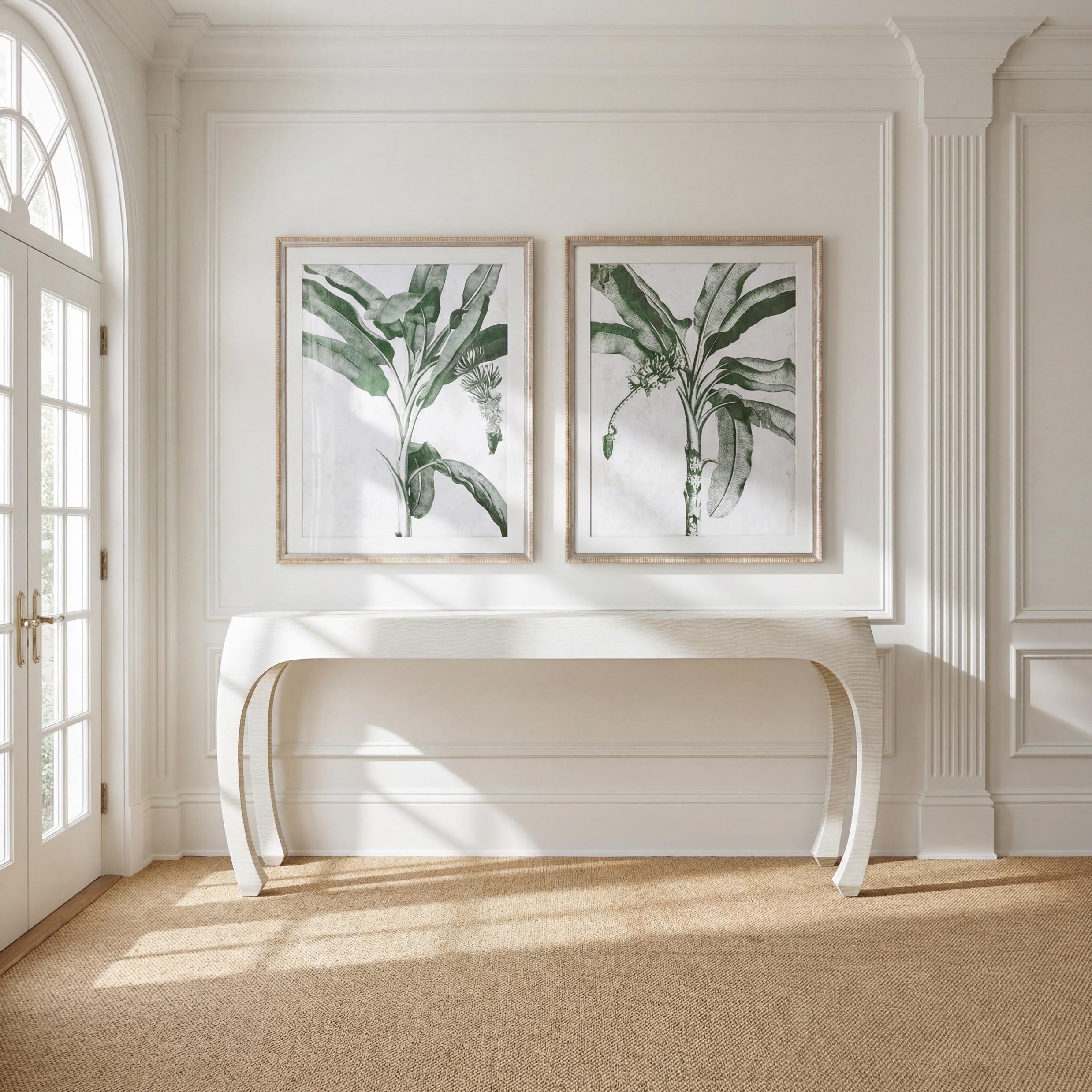 HIBISCUS Above: Great House Hall Mirror, Driftwood: F-010-3-121-002; Hibiscus Hall Chest, Silk Linen: F-156-3-155-12B; Hibiscus Hall Chest, Indigo: F-156-3-155-09B; Hibiscus Hall Chest, Seal Brown: F-156-3-155-96B