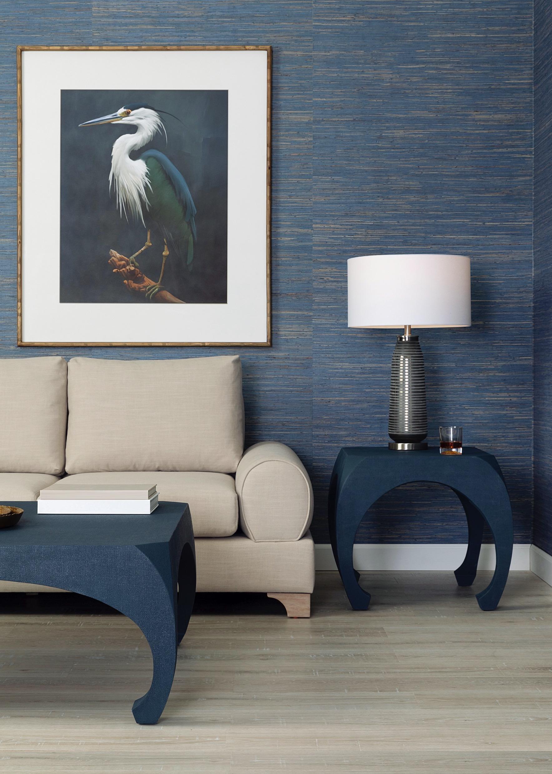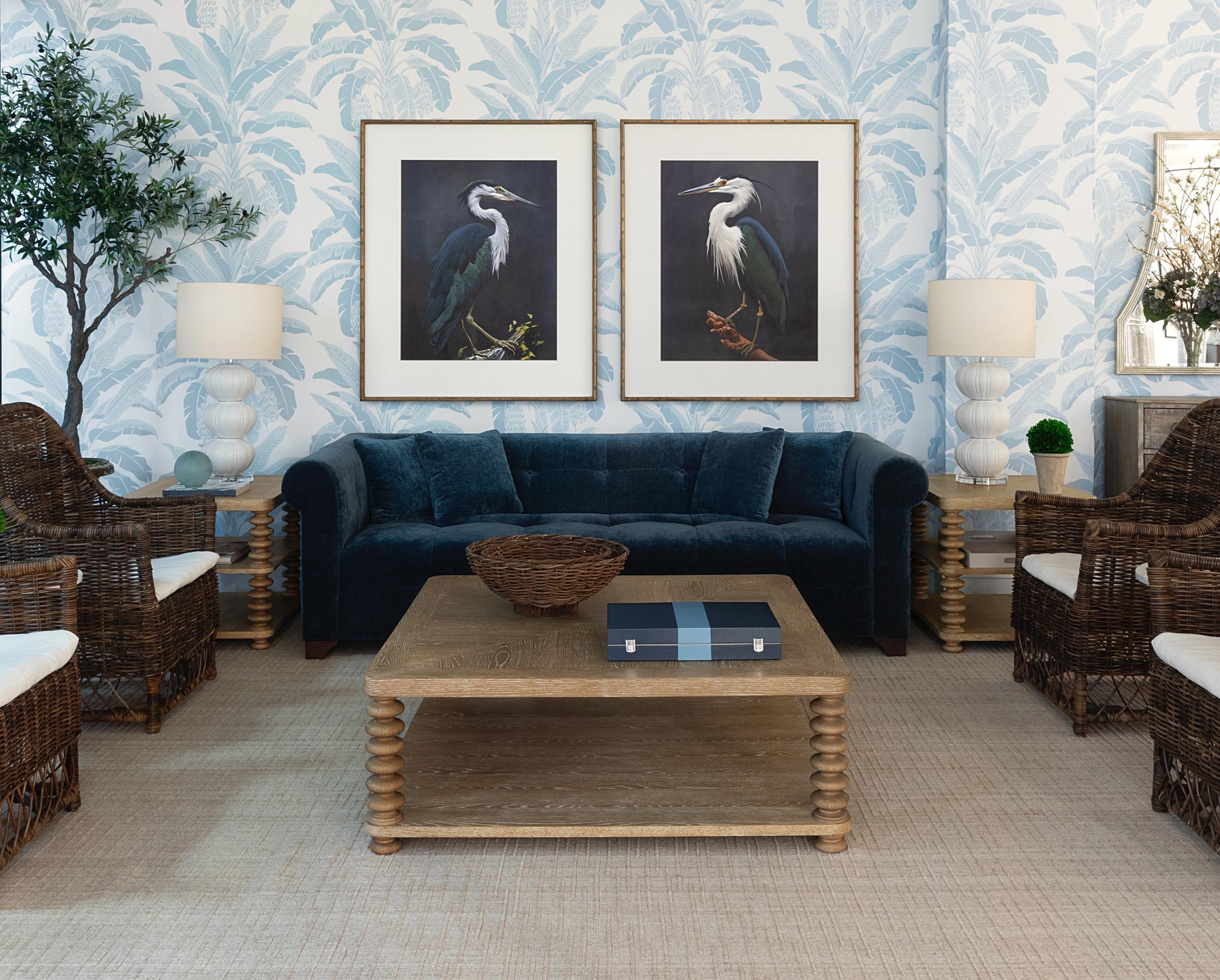 Left: Birds of a Feather Framed Heron Wall Art, 2 Assorted Styles: D-044-3-479-500, Island Palm Rattan Decorative Bowls, Set of 2: D-051-3-340-86B, Balboa Bay Ski Backgammon Game, Indigo: D-052-3-445-09B, Montego Bay Dune Hand Woven Rug, 9'3" x 13’: D-108-3-650-26F, Faux Olive Tree with Weighted Black Pot, 78”: D-014-3-521-16H, Sea Glass Decorative Orb Small: EAB20481, Collection of Boxwood Topiaries, Set of 6: EBD80076, Muriel Urchin Table Lamp: ELT10022, Tuxedo Sofa, Imperial Indigo: F-003-3-187-105, Oak Bluffs Cocktail Table, Driftwood: F-012-3-026-02A, Oak Bluffs Lamp Table, Driftwood: F-012-3-040-02A