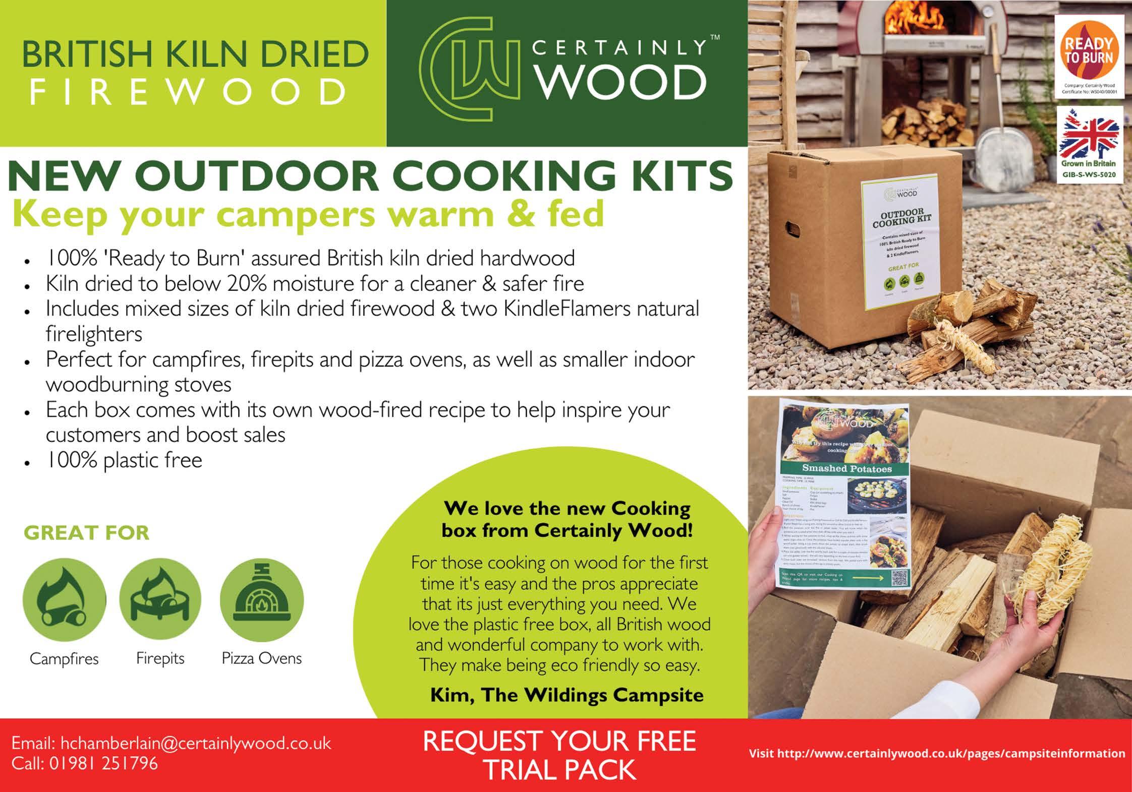 As a follow on to this, we have now launched our new Cooking Box. Not only is this a large cardboard box, but also contains a greater range of log sizes, and two of our amazing KindleFlamers natural firelighters along with a recipe! We are keen to get your campers to experience cooking on their campfire and the pleasures of cooking on wood. Nothing beats the satisfaction of cooking your own supper over a fire and the aromas and flavours that prevail!