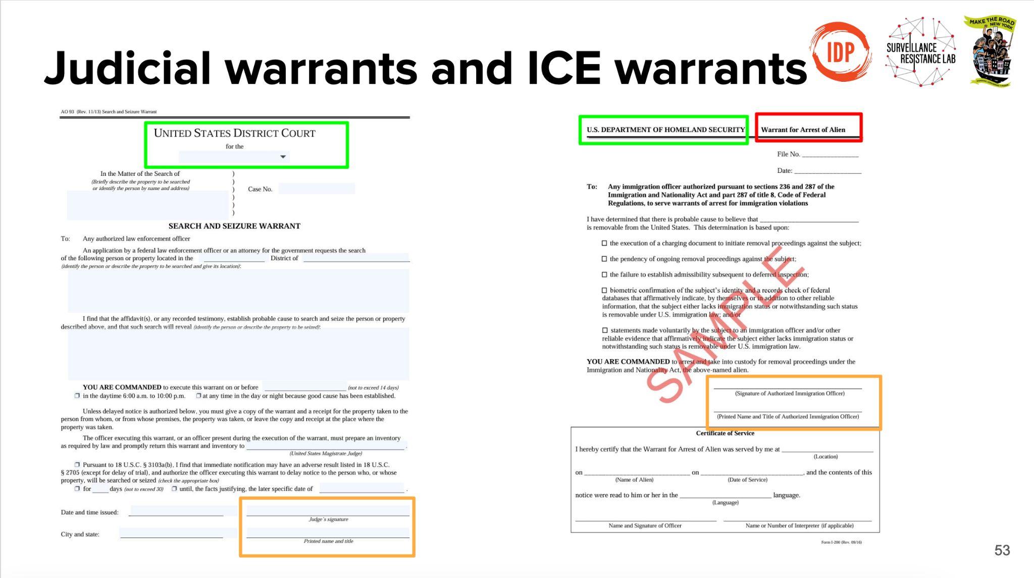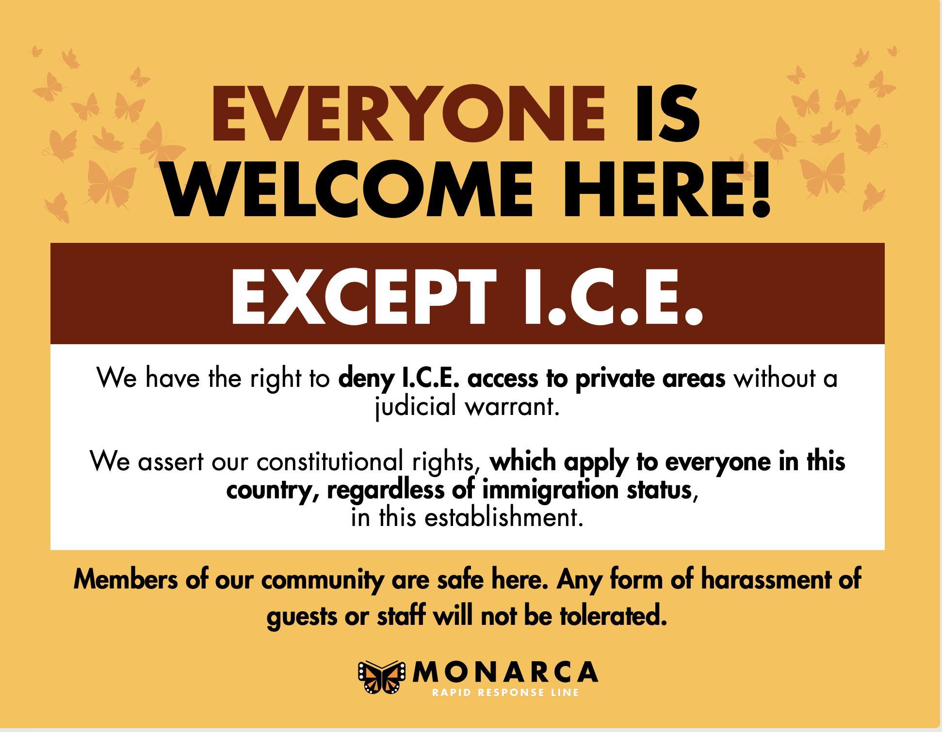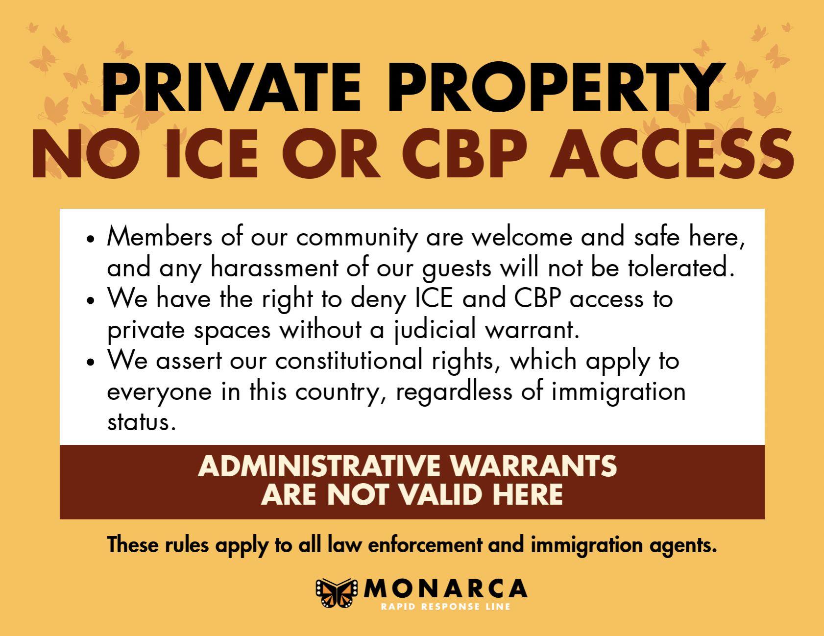 • ICE can enter public spaces without a judicial warrant: restaurants, coffee shops, stores, etc. These workplaces should make sure to have a private room with clear signage. ICE cannot enter those private spaces without a judicial warrant.