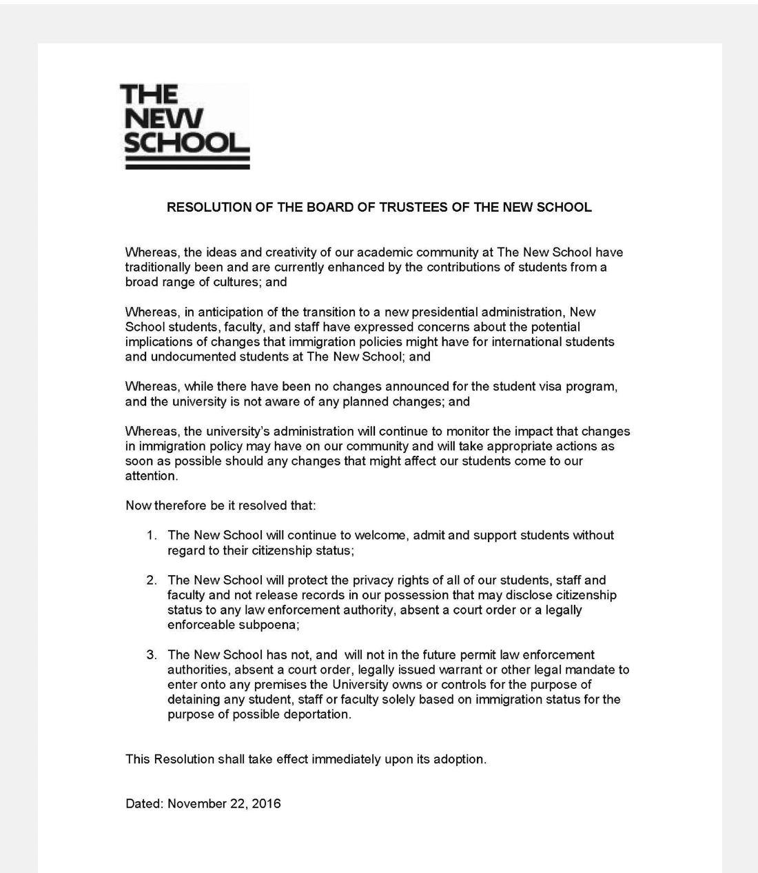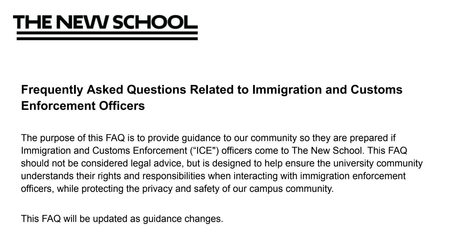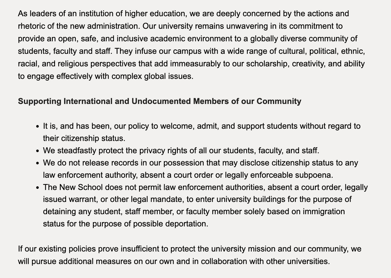 ● Specifically, it is, and remains,The New School’s policy to welcome, admit, and support students without regard to their citizenship status.