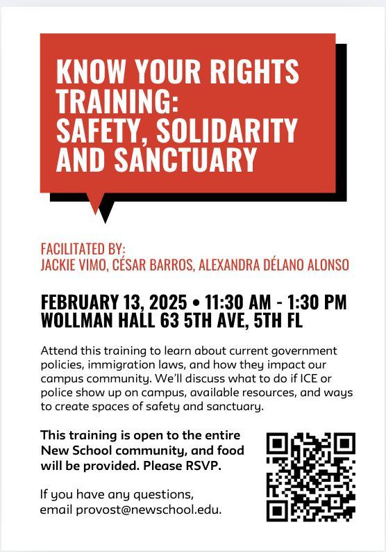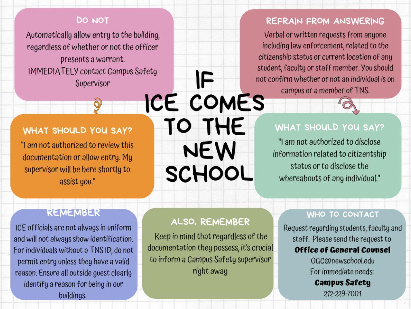 ● AndThe New School does not permit law enforcement authorities, absent a court order, legally issued warrant, or other legal mandate, to enter university buildings for the purpose of detaining any student, staff member, or faculty member solely based on immigration status for the purpose of possible deportation.