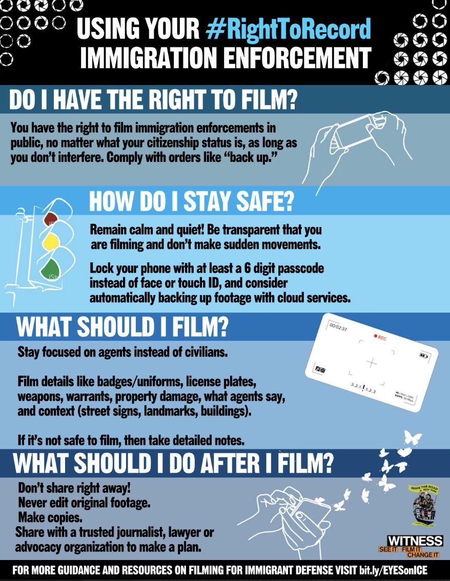 De-Escalate: If you see ICE or DHS, stay calm. Do not be hostile, because they may take it out on the person you are trying to protect. ICE doesn’t have jurisdiction over citizens.Assert your rights to record and bear witness. Be aware that physically obstructing is a crime.