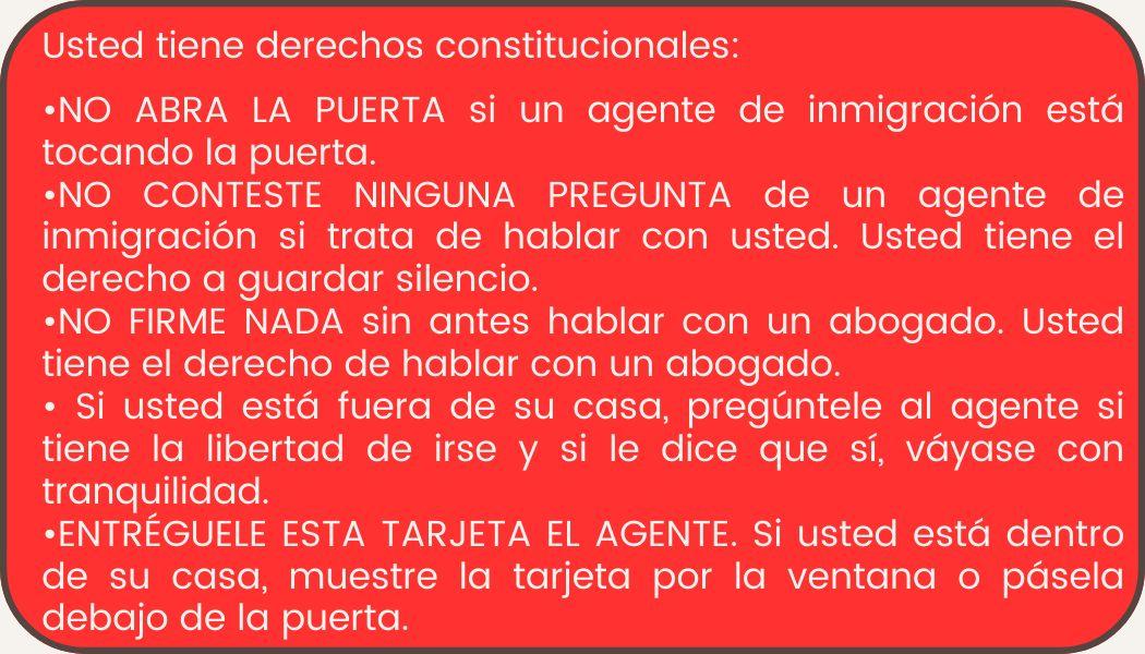• Ask the people knocking the door to identify themselves. It is possible that, if ICE is at the door, they will say “Police”.
