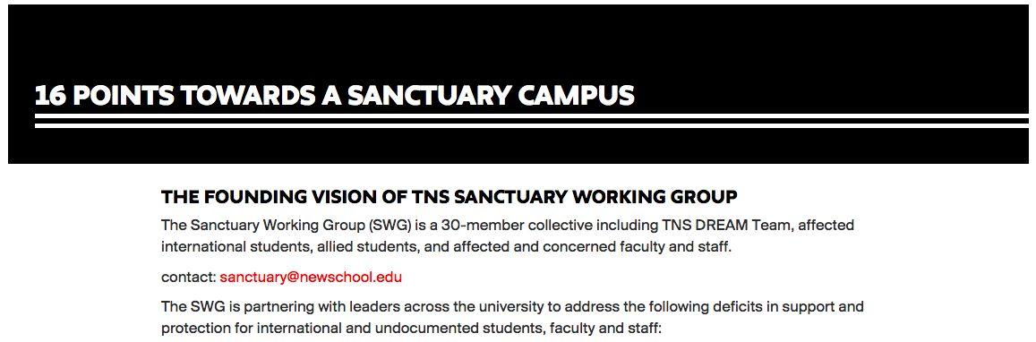 16. To publicize broadly that the New School is a sanctuary campus. To be effective, TNS must implement these steps in consultation and collaboration with the members of our community who are directly affected, including the students, faculty and staff who are members of the SWG and TNS DREAM Team.