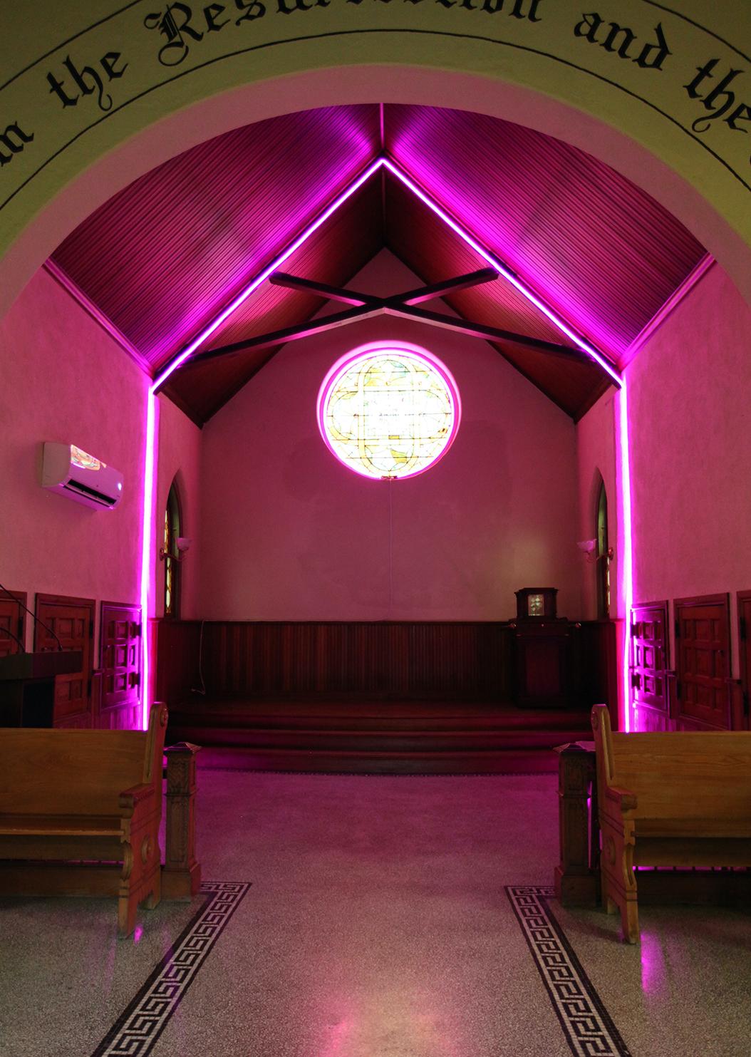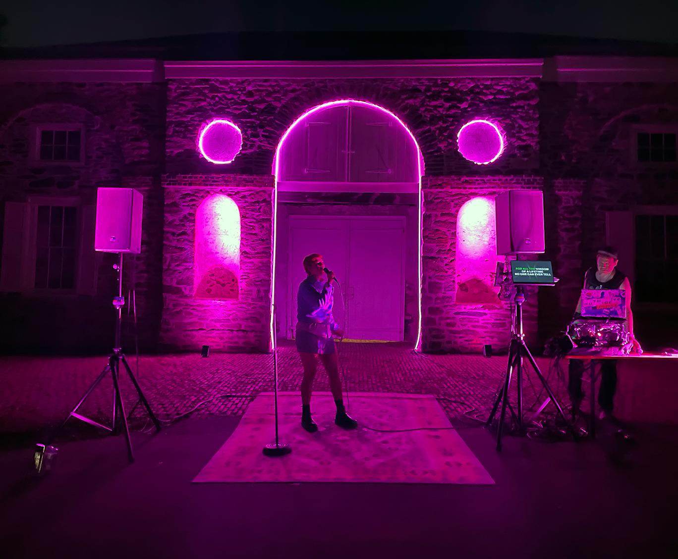 Visitors enter the cemetery as the sun is setting. By dark, the installation of neon lighting illuminates and accents the architecture already present at each cemetery site. This project can be indoors or outside, depending on the cemetery’s landscape and specificity. The lighting provides a physical framework, a container for participants to activate and fill with songs I’ve included images from the first two sites, Congressional Cemetery, D.C. (indoors, chapel) and The Woodlands, Philadelphia (outdoors, stable) The installation for each site is different, and I discuss and plan this with cemetery staff to center the attention to care within these historic places. What makes this project so compelling, for me as an artist, is how different each experience is. The architecture/landscape is unique to every site, the participants and the songs of grief they share are never the same, and each city and night has a dynamic crowd. All while there is a need to create spaces to express grief is ongoing.