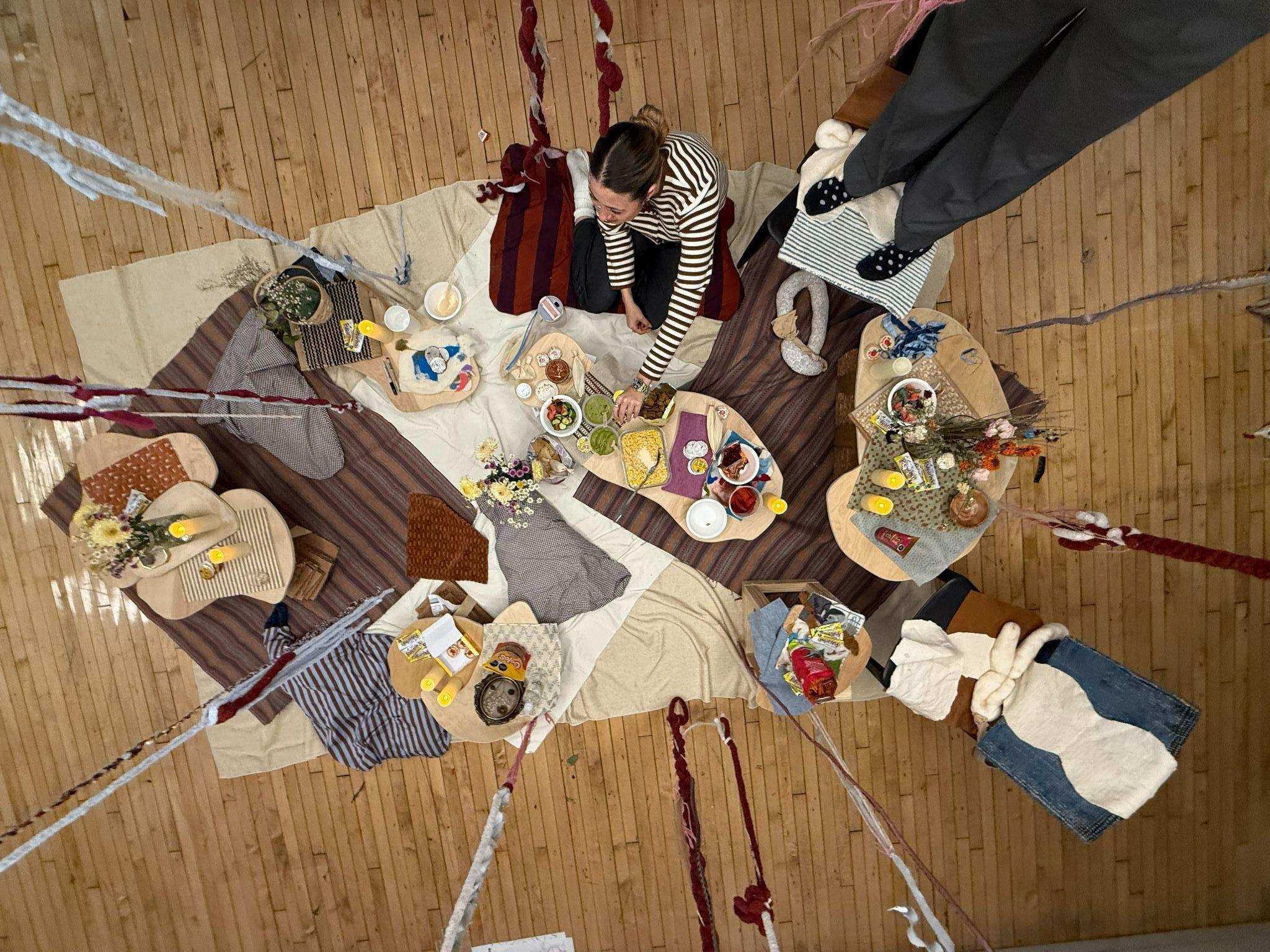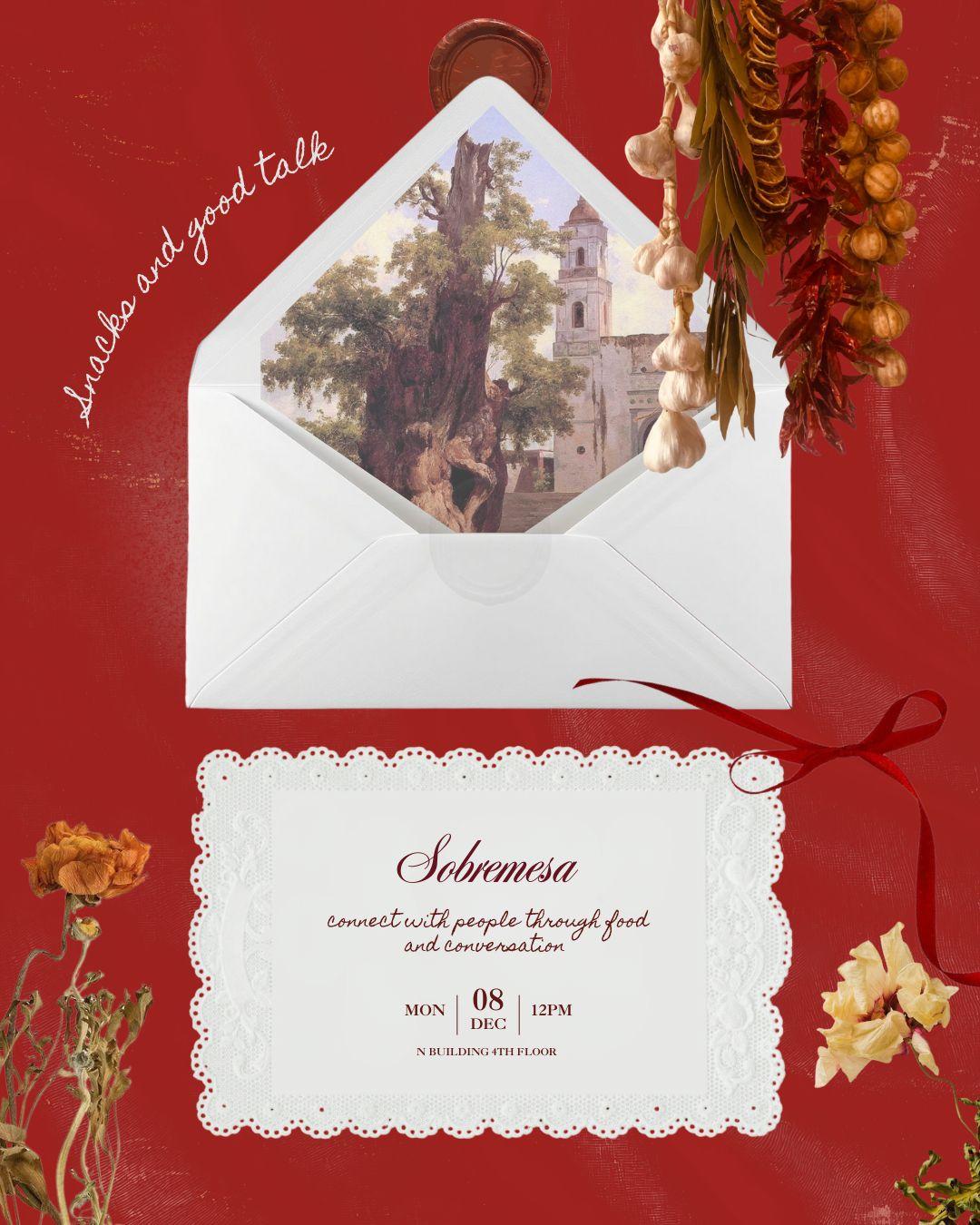 Sobremesa is a ritual that connects individuals through the sharing of food and conversation, transmitting the warmth and customs of Latin culture. Using fabric, thrifted plates, and decorative food, it creates a safe and intimate space where community and belonging are fostered. Through this shared act, those far from home can rediscover the comfort and familiarity of their origins.