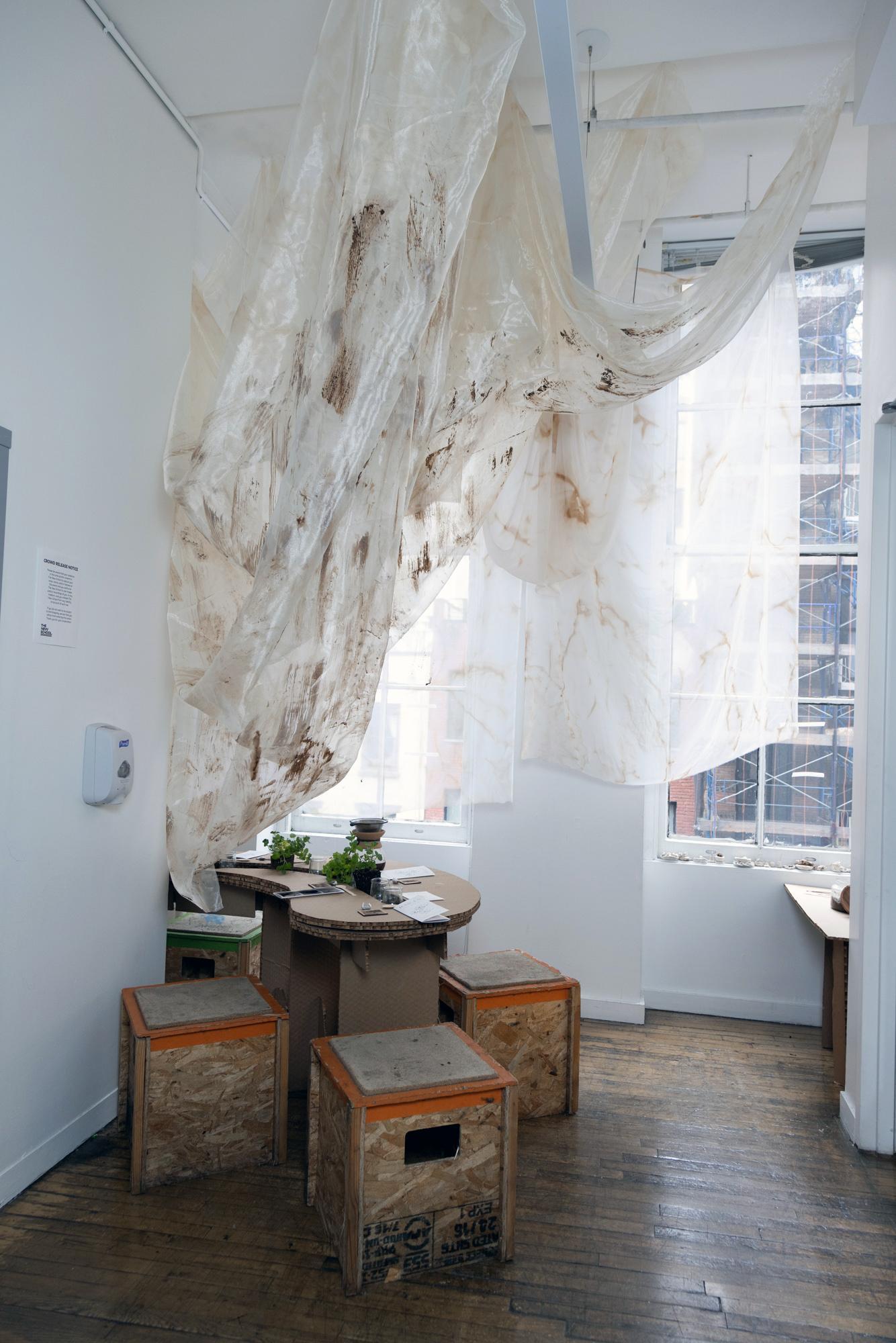 The ritual begins outside of the lighting lab on the 3rd floor. Participants are told to remove their shoes and prepare their minds for a period of mental freedom/untethering. The space is one to experience alongside others, but it is not intended for conversation. Entering the room, participants will walk down a gauzy corridor constructed of fabric hanging from the ceiling, and emerge into a space where projections and colored lights create an atmosphere of tranquility and peacefulness. A droning synth/sine wave sound is played over speakers and as time goes on, this soundscape builds to include bird songs and soft piano. The lights pulse very slowly to encourage restful breathing and slowed heart rates. Participants are encouraged to move freely throughout the space and interact with the fabric installations as they see fit.