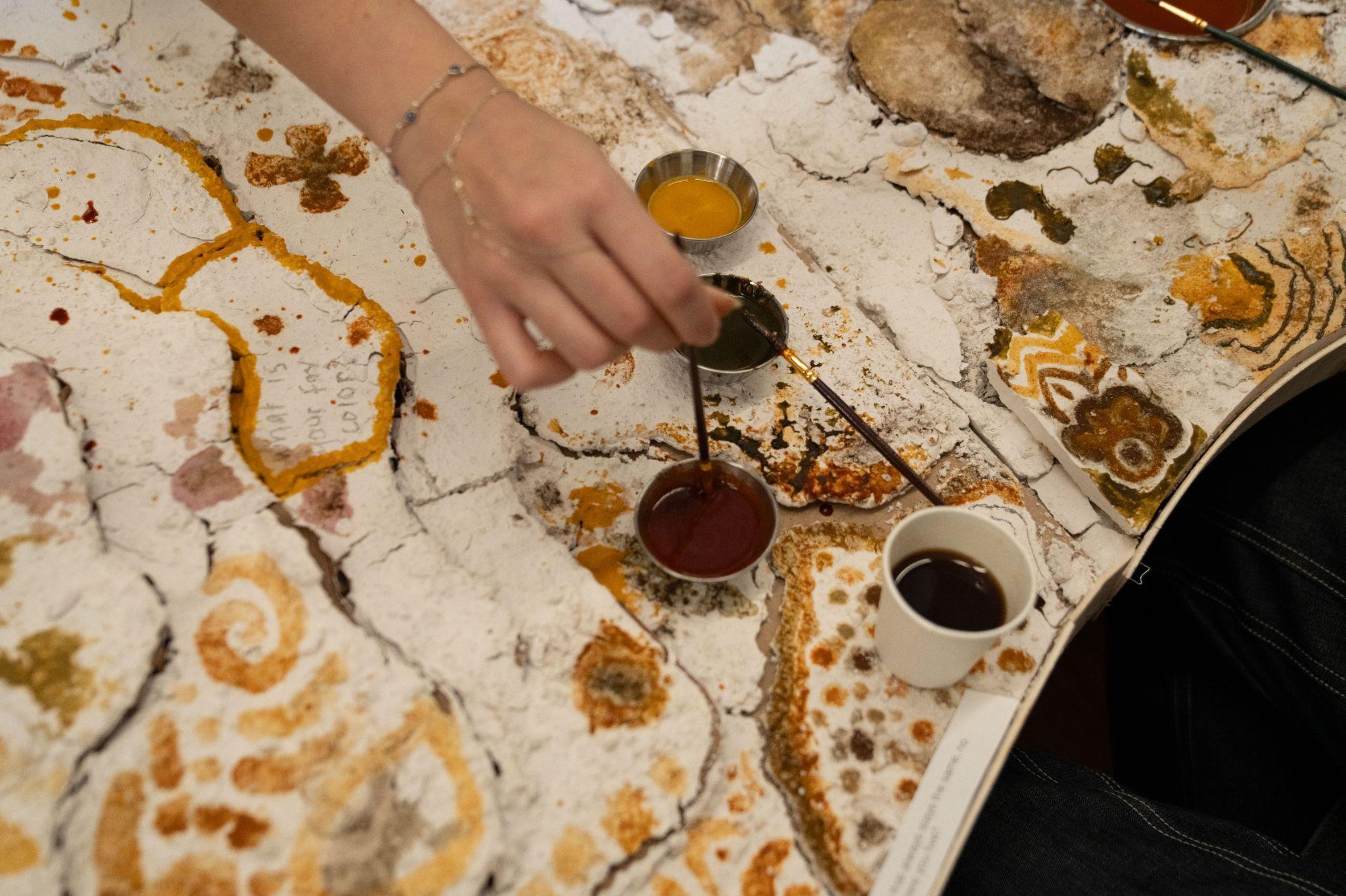 After a long coffee session, they are encouraged to dump their coffee grounds directly onto the bio-based Mehndi-motif tabletop and use the painting tools to use henna and coffee to be creative and messy. We seek to create collaboration through self-expression.