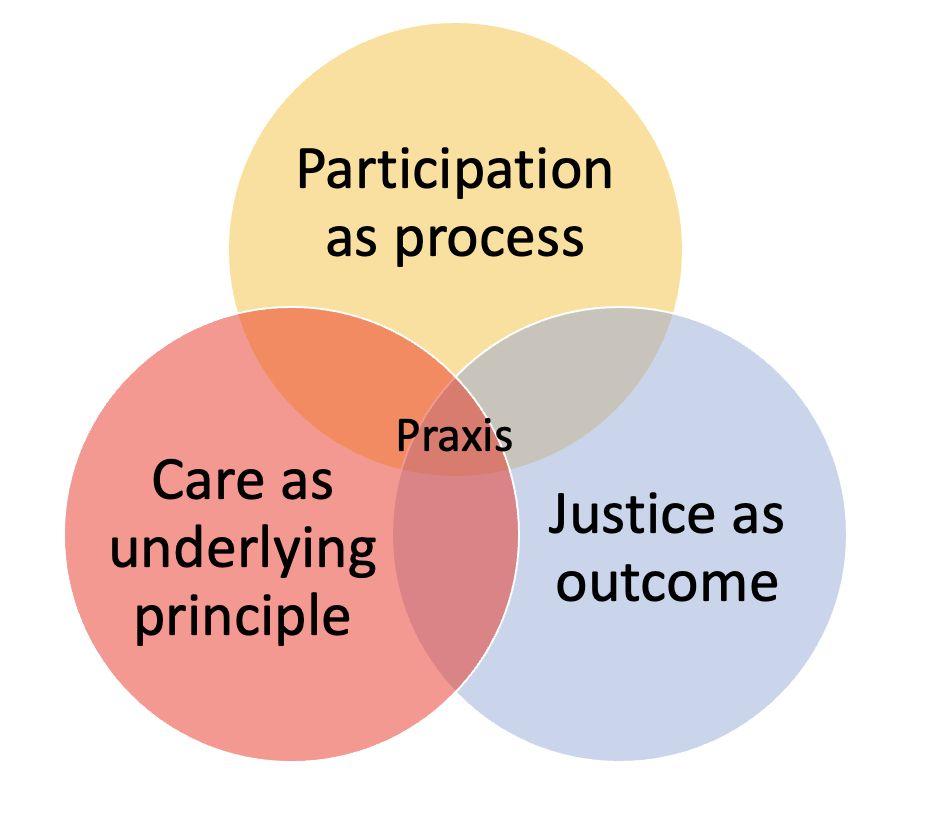 ALT TEXT: Venn Diagram: Three intersecting circles, with text “participation as process”, “care as underlying principle” and “justice as outcome” and the intersection is “praxis”