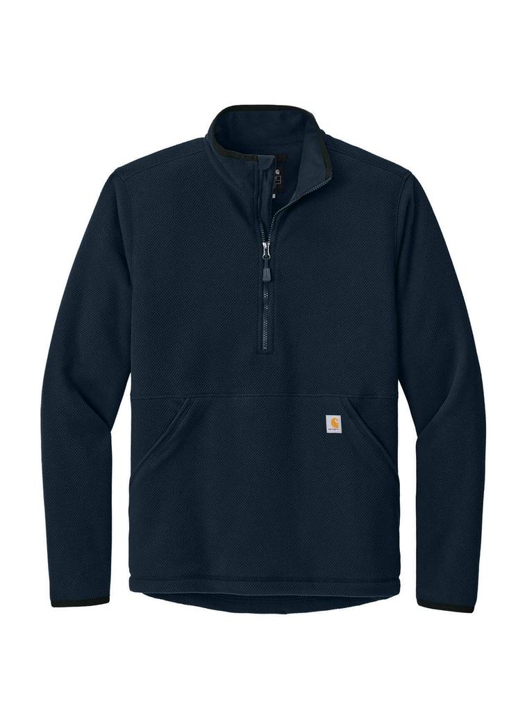 The Carhartt Men's Textured 1/2-Zip Fleece Jacket is built for warmth and versatility, whether for the job site or at a backyard barbecue. Made from 7.3-ounce 100% polyester, these custom quarter-zips feature a zip-through collar and a convenient halfzip front for easy layering. Two lower front zippered pockets on this quarter-zip provide secure storage, while elastic binding cuffs and an adjustable drop-tail hem offer a comfortable, relaxed fit. Finished with a Carhartt label on the left pocket, this custom embroidered quarter-zip is ready for any task.