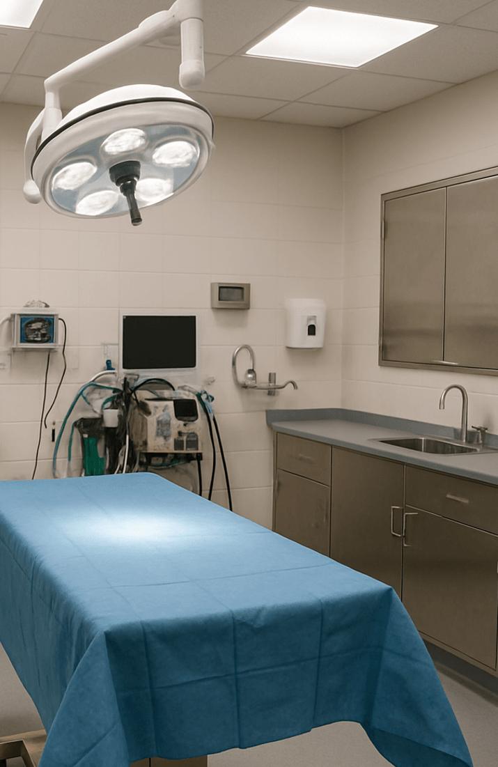 Champs chirurgicaux stériles en SMS avec protection à trois couches : couches externes en spunbond durable et couche centrale en microfibre qui filtre les liquides et les particules.