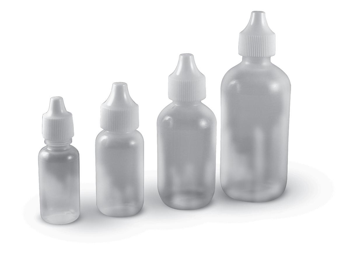 Embout compte-gouttes amovible pour le remplissage. Bouteille et embout faits de polyéthylène faible densité. Bouchon à vis fait de polystyrène. 12 par boîte.