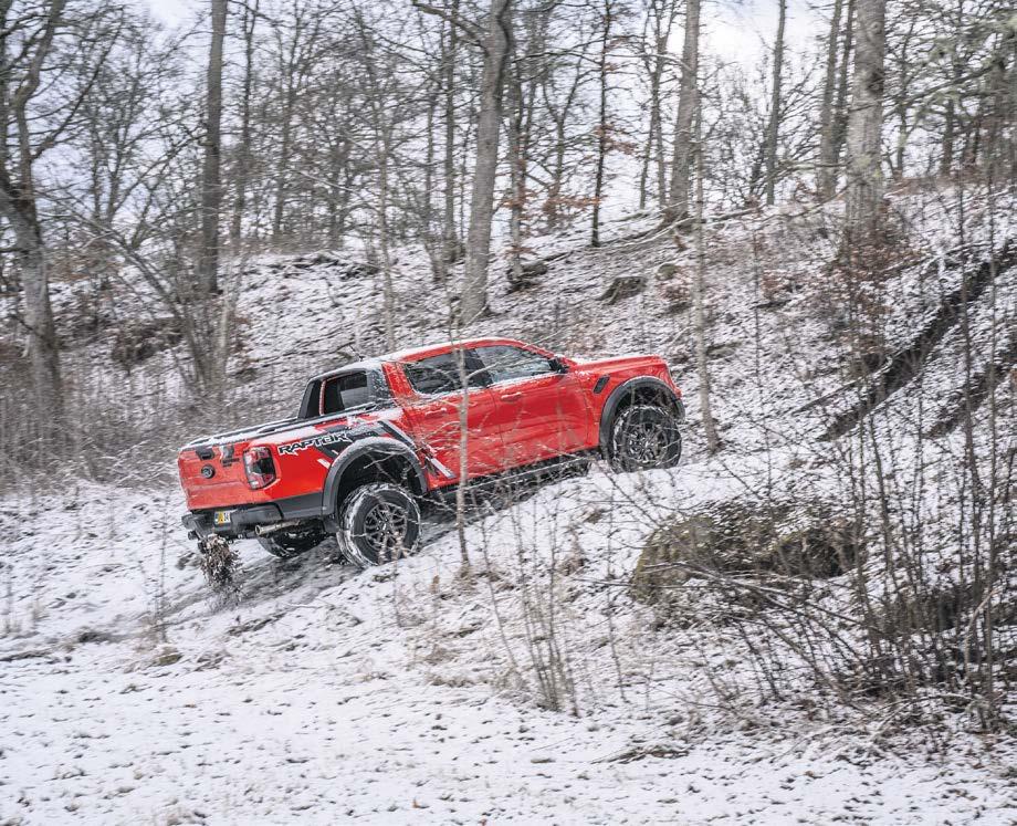 tæmmer jeg lysten til at sparke til speederen igen. Efter et let knæk i vejen mod højre, forsvinder stengærderne nemlig, mens skoven åbner sig. På venstre side bliver gærdet erstattet af en skrænt, og den følger skovvejen hele vejen ned ad bakken. Samtidig hælder vejen udad og ned mod skrænten, som om Modernatur bevist vil skubbe os udover kanten. Det mentale billede af en overstyring, der sender mig og bil ud over siden og ned i – måske ikke den visse død – men så en totalskadet offroader, passerer i et splitsekund forbi min frontallap. Alligevel pisker jeg alle 292 heste ud på marken igen, og skærver på størrelse med børnehænder flyver op i skærmkasserne. Bagenden bevæger sig ud, men et vrik kontrastyring fra det præcise styretøj får os på ret køl. Det er faktisk lige præcis her, jeg bliver allermest imponeret over den nye Ford Ranger Raptor. Ikke over hvor nemt den æder et flyvehop, men hvor godt den står fast et sted, hvor det ikke burde være muligt. Jeg blæser afsted over skærver så ujævne, at du skal passe på anklerne, hvis du gik her i vandrestøvler, og alligevel bliver bilen i sporet. Igennem sving, hvor underlaget er både hullet og uden greb, kan du holde en fart, der ville udfordre almindelige biler – selvom de kørte i samme sving på nystrøget asfalt. Raptor elsker fart, og gennem testugen går det op for mig, at Ford har skabt en rallybil med et lad. Jo hurtigere du kører, jo grovere terrænet er, jo mere imponerende er Ranger Raptor.
