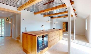 direkte til køkkenet. I den anden ende af hovedbygningen, på den anden side af køkkenet er der stort værelse/kontor, et mindre værelse med lækkert eget badeværelse, et ekstra toilet samt stort fællesrum med loft til kip og flotte bjælker (motionsrum, bordtennisrum, stort fælles kontor, - mulighederne er mange). Trappe til lille 1. sal med endnu et værelse. Forældreafdeling på 1. sal med flot badevær.