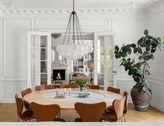 alrum indrettet med de mest luksuriøse løsninger og hårde hvidevarer i absolut topklasse. Det ovale køkken-alrum har et smukt vinduesparti mod gården og naturligvis vinkøleskabe. Herfra er der adgang til den meget store dagligstue – oprindeligt to stuer – hvor spisestuen er placeret i den ene ende og sofamiljøet i den anden. Den imponerende loftshøjde giver samtidig optimale muligheder for at opstille kunst og dekorative installationer. Derudover rummer lejligheden et herreværelse/bibliotek med pejs/brændeovn og unikke indbyggede løsninger, et gæsteværelse/kontor med indbyggede skabe samt et master soveværelse med direkte adgang til et luksuriøst badeværelse med kar og brus og separat toilet. Til gæsteværelset/kontoret hører der eget badeværelse. Bagest i lejligheden findes desuden et funktionelt vaskerum. Lejligheden er istandsat med stor respekt for ejendommens oprindelige karakter og håndværksmæssige detaljer, blandt andet med smukke snedkererede indbygningsskabe. Der er tilladelse til husdyr samt brugsret til både kælder- og loftrum samt gården.