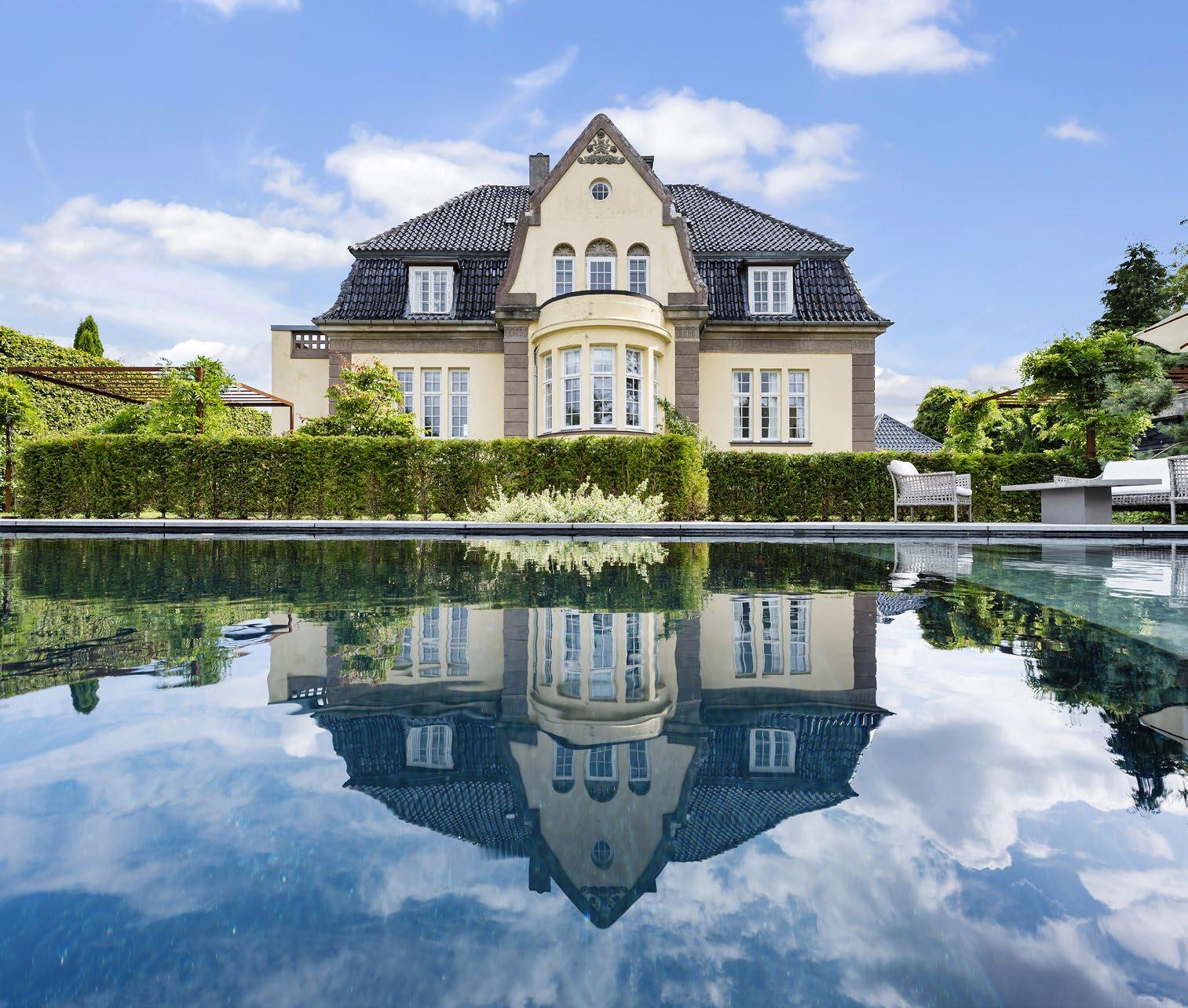 Sådan en bygning er Kollemosevej 6. Det er et slot på en stille og rolig vej. Haven er ikke parklignende, som ejendomsmæglerne plejer at sige, når haven er lidt større end en parcelhusgrund. Næh, haven ER en park, fordi den er kultiveret med alt i stedsegrønt som buskbom, formklippede thujaer, taks og cypresser. Her er meget grønt med fine kig til smukke, anlagte haverum, terrasser og et loungemiljø omkring ferskvandssvømmesøen, hvor vandet renses af biologiske processer uden klor. Det er rent, klart og inviterende. Men altså, fælles for parker er, at her spadserer man, en park er nemlig anlagt for at blive set, anlagt for at blive beundret. Og her er plads til den, for grunden er på 3035 m2. Plads er der også indenfor. Ja, ikke mindre end 682 etagemeter i hovedbygningen, hvor de 235 m2 ligger i underetagen. Højt til loftet, stuk og rosetter, høje paneler og de fineste træudskæringer. Altså åndværk. Mange soveværelser, alt er herskabeligt lækkert lige til flytte ind i. Portnerboligen er på 98 etagemeter, hvor de 49 m2 også er bolig for au pair eller udlejning. Herudover en fredet stald og garager. Kollemosevej ligger i et roligt kvarter med kort cykelvej til dagsinstitutioner og Holte Skole, der er vurderet som en af landets bedste skoler. Holte Midtpunkt ligger 10 cykelminutter væk til alle indkøb.