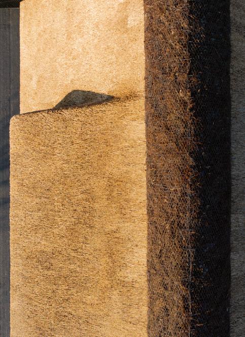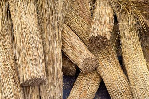Sandehusenes karakteristiske græstag bæres af kraftige, runde tageåse, som fremstår synlige i de store, højloftede rum, der overalt går helt til kip.