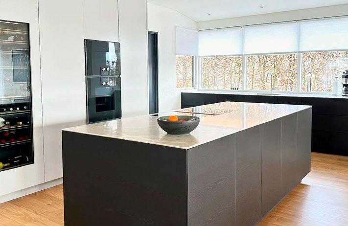 Vivi og Niels Erik valgte et Form 45 køkken i sort eg med højskabe i Form 2 i farven pastelgrå samt en bordplade i quartzite mistral.