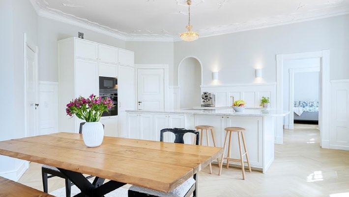 Boligen er totalrenoveret fra A-Z med stor respekt for de originale detaljer: Gennemgående nyt sildebensparket i egetræ – gulvniveau justeret, ingen dørtrin. Køkkenet flyttet centralt og åbnet op for lys og udsigt over pladsen. Håndlavet køkken fra Nordiska Kök med 3 meter lang køkkenø i poleret Taj Mahal kvartsit (hejst ind med kran). Nye Siemens hvidevarer + vinkøleskab fra Temptech. To luksuriøse badeværelser med gulvvarme, specialfremstillede Kuma-bordplader og Scandtap-armaturer i gunmetal/ shadow finish. Helt ny el-installation, loftsudtag med dæmpning og stukrosetter, samt ethernet-porte til stabilt internet. Ny vaskesøjle i separat rum med støjdæmpning. 10 nye radiatorer med fjernbetjente termostater. Renoveret og ny stuk, originale døre og greb nænsomt bevaret.