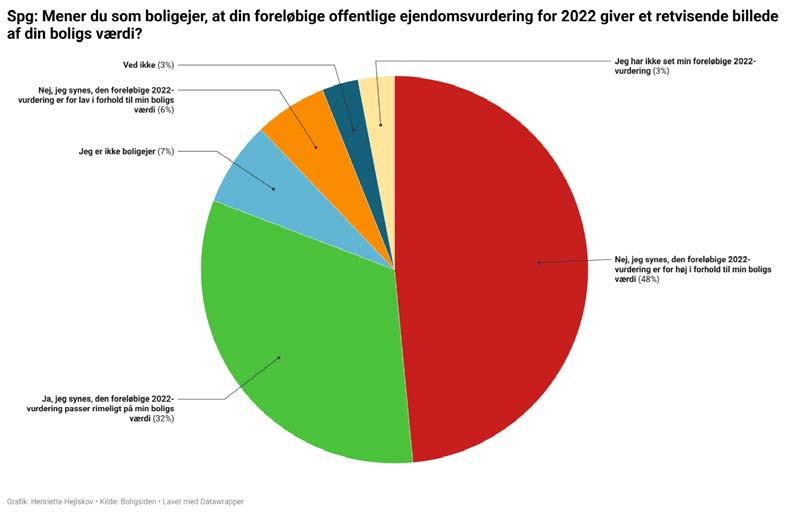 I den anledning har Boligsiden spurgt sine brugere om, hvorvidt de som boligejer selv mener, at den foreløbige ejendomsvurdering for 2022 giver et retmæssigt billede af deres boligs værdi. Til det svarer størstedelen af brugerne nej. Således svarer 48 procent af Boligsidens brugere, at de mener, deres foreløbige 2022-vurdering er for høj i forhold til deres boligs værdi.