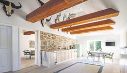 Hovedhuset på ejendommen er en sand perle. Den klassiske / originale arkitektur smelter smukt sammen med omgivelserne og giver et skræddersyet hjem, der emmer af komfort, elegance med respekt for gårdens oprindelse. Flere vindues partier bringer naturen ind i stuerne, hvor du kan nyde udsigten til den smuk anlagte park og markerne, medens du slapper af ved pejsen.