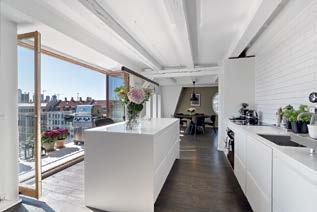 ret, her er varme i gulvet, plankerne er de knastfrie fra Dinesen, køkken, badeværelse, alt er bare så lyst og lækkert. Veluxvinduer og varme styres fra en app, og så har vi ikke nævnt hvor den smukke trappe fører hen. Til tagterrassen, som er en privat møbleret udendørslounge med grill og badekar. Her kan man sommerog vinterbade, for der er varmt vand i hanen, også til bruseren. Ja, vildt må det være at sidde på taget i sit eget badekar som en nyfødt Bubber og kigge ud til Carlsberg Byen og byens lys over hustagene i København en kold vinteraften.