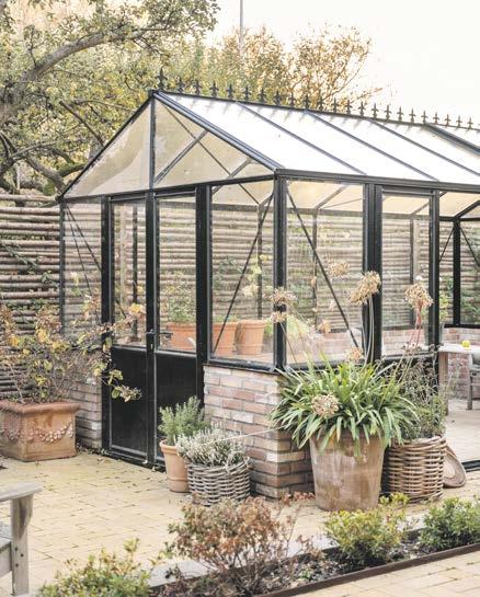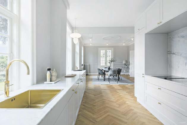 oprindelige, ligesom vinduerne med trukket glas. Og når vi nu befinder os på Magrethevej, er det vel oplagt at tilføje, at den fløjlshandskebløde behandling af facadens døre og vinduer er foretaget af de samme hænder, der har renoveret Amalienborg og andre bevaringsværdige bygningsværker. Møller Stuk har genskabt husets originale stuk og fyldningsdøre, og malerpenslen er svunget i samarbejde med File Under Pop i farver som huset blev født med. Man kunne blive ved med at fortabe sig i suk over alle de indvendige herligheder, men vi må jo også i haven og finde ud af, hvad der er med det lommetørklædetræ. Først tager vi dog lige trappen fra det nye Kvanum-køkken, som i lige linje fører til orangeriet, der dermed lægger et både yndigt og funktionelt rum til havens knap 600 m2. Både morgen- og aftensolen finder vej på terrasserne og ikke mindst gennem de store vinduespartier og døre, der favner huset hele vejen rundt. Haven er ligesom resten af matriklen stort set vedligeholdelsesfri, takket været den kyndige havearkitekt, men er der grønne fingre i familien, vil de dog nok glæde sig over de detaljerede tegninger med opmålte bede og navngivne blomster. Og så nåede vi da endelig til det fredede og berømte lommetørklædetræ, som folk valfarter til for at opleve i blomst med forårets komme.