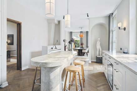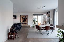 dedør ledes du ind i stuen som prydes af en håndsnedkereret reolvæg, der kravler over døren. Et stort snedkerkøkken i direkte forbindelse med spisestuen med hvidevarer fra Gaggenau. Fra både spise-