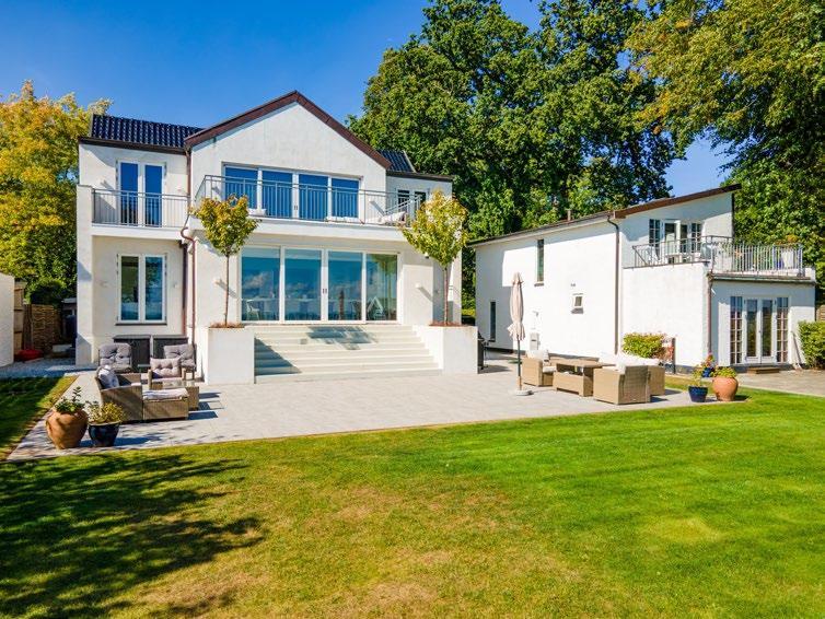 gårdhaven samt tre stuer en suite med stukkatur og flot lysindfald. På 1. sal findes masterafdeling, børneværelser med eget bad og kontor med balkon. Den 1.918 m² store grund er anlagt som en frodig have med rododendron, blomstrende buske og kandelabreklippede træer. Her kan solen nydes fra gårdhaven og terrasserne dagen igennem.