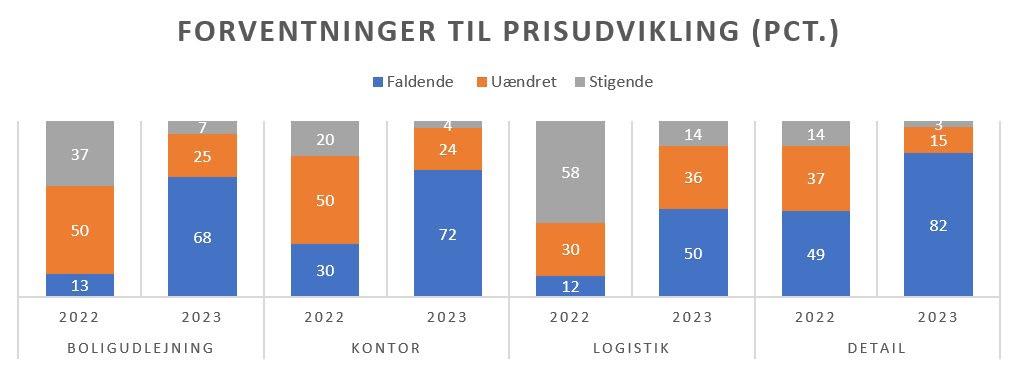 nu en solid overvægt, der forventer prisfald. På de egentlige erhvervssegmenter er der gode, fundamentale grunde til at forvente prisfald. De fleste økonomer forventer lavere beskæftigelse, og det vil før eller siden sætte sig som højere tomgang i kontorejendomme. I detailsegmentet er den højere tomgang allerede synlig i gadebilledet og i mindre og mellemstore indkøbscentre, hvor mange handlende har drejet nøglen om.