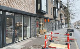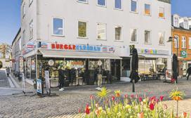 Ejendommen fremstår velholdt med rene facader og stort glasparti mod Taastrup Hovedgade.