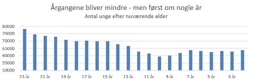 På lidt længere sigt vil årgangene blive mindre, så der også vil være mindre tryk på boligmarkedet ved studiestart. Men vi skal endnu tre-fire år ud i fremtiden, før de nye årgange, der flytter hjemmefra, for alvor bliver mindre.