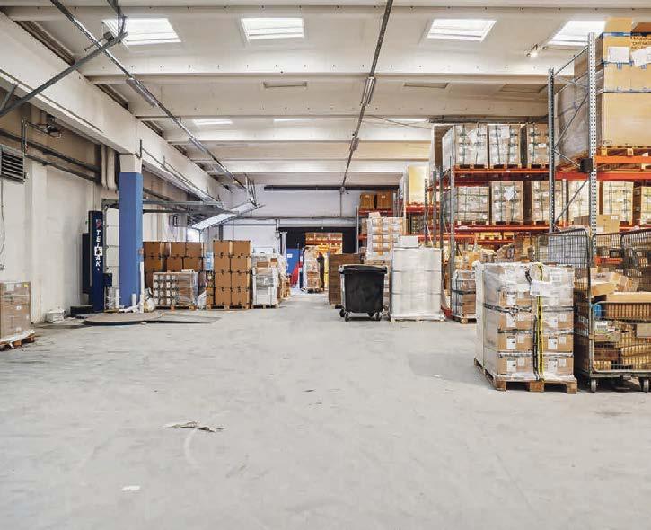 Ejendommen har en god fordeling mellem kontor og lager og består af ca. 332 m² kontor og 1.358 m² lager heraf er ca. 500 m² lager med køl, mens ca. 680 m² er højloftet.