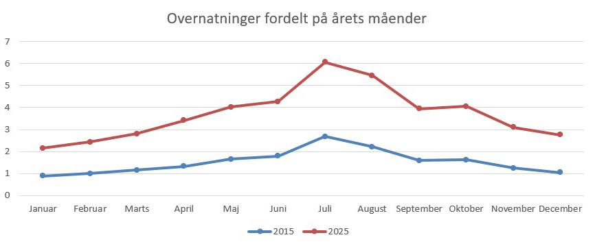 Men det er ikke tilfældet. Tværtimod har hotellerne formået at sprede omsætningen mere ud over året. April og december er de kalendermåneder, hvor antallet af overnatninger er vokset mest, mens væksten har været mindst i den måned, der alligevel forbliver den største, nemlig juli.