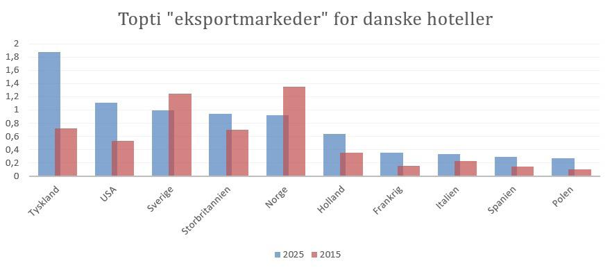 Samlet set steg antallet af overnatninger på hoteller med 5,9 pct. sidste år. Der er langt over stigningen i bruttonationalproduktet, og hotellerne fylder altså en større og større andel af den økonomiske aktivitet i Danmark. Nok så interessant, så er det især den del, man kunne betegne som eksport, der er i fremgang. Mens antallet af danskeres overnatninger ”kun” steg med 4,0 pct., steg antallet af udlændinges overnatninger med det dobbelte, altså 8,0 pct.