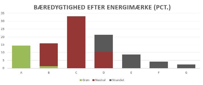 Energiselskabet NRGi, som er medforfatter på klummen, har regnet på sagen, ud fra data for hele 30.492 energimærkede erhvervsejendomme, spredt over det ganske land. En konklusion er, at ikke færre end 26 pct. alt andet lige står til at blive usælgelige – at blive såkaldt strandede aktiver – om mindre end ti år, hvis ikke ejerne gør noget for at reducere ejendommenes klimabelastning. Det er en skæbne, der kan overgå ca. halvdelen af ejendommene med energimærke D og samtlige ejendomme med energimærke E, F og G.