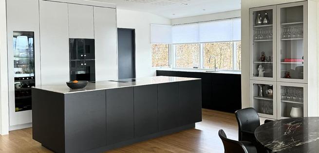”På besøget hos Multiform så vi bl.a., hvordan en medarbejder arbejder med at beklæde lågerne med finer, så udtrykket på køkkenet bliver fantastisk flot. Min mand fik også lov til at prøve at samle en af de massive træskuffer med svalehalesamlinger. Det var slet ikke nemt,” siger Vivi med et smil. Under besøget fik ægteparret oplevelsen af, hvad det vil sige at få lavet et gennemtænkt køkken i en kompromisløs kvalitet med tanke for alle detaljer. De valgte et Form 45 køkken i sort eg med højskabe i Form 2 i farven pastelgrå samt en bordplade i quartzite mistral.