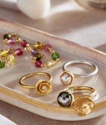 The collection interprets creatures and textures of the ocean in playful designs with quirky details. The Young fish ring holds a pearl that bounces when you touch it. The Young Fish earrings can be styled with a variety of changeable pendants and thereby transform into a range of expressions.