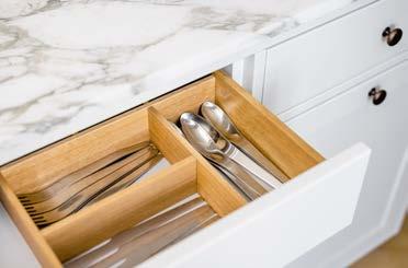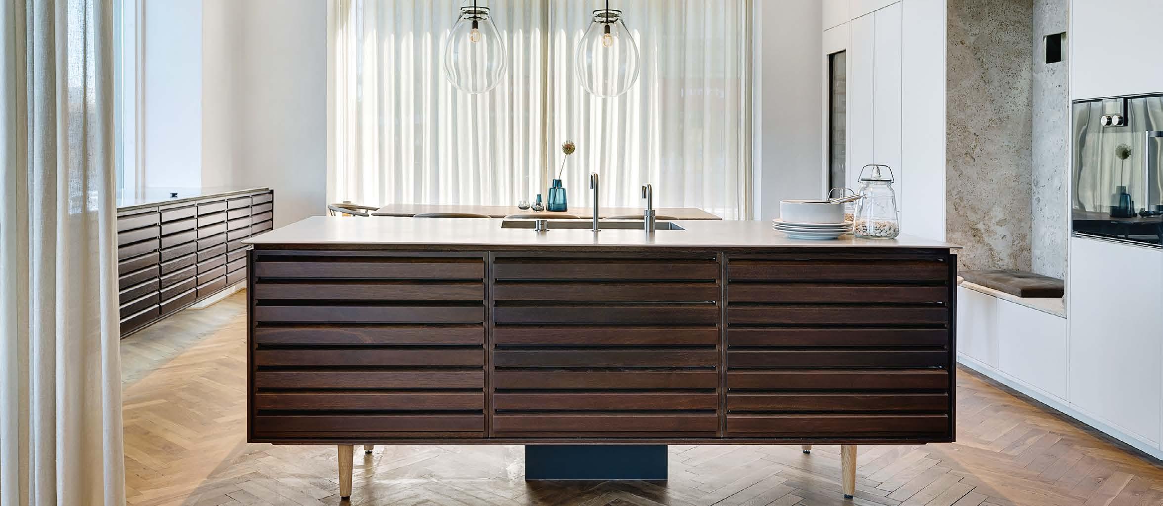 te arbejder hun også med en bred palette af smukke træsorter, ligesom hun gerne udnytter samspillet mellem forskellige metalliske overflader – fx bruneret messing og rustfri stål. “Teamet udfører også køkkener, der indfarves i RAL-farver, så køkken, vægge, gulve og lofter passer sammen som en helhed.”