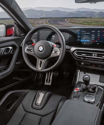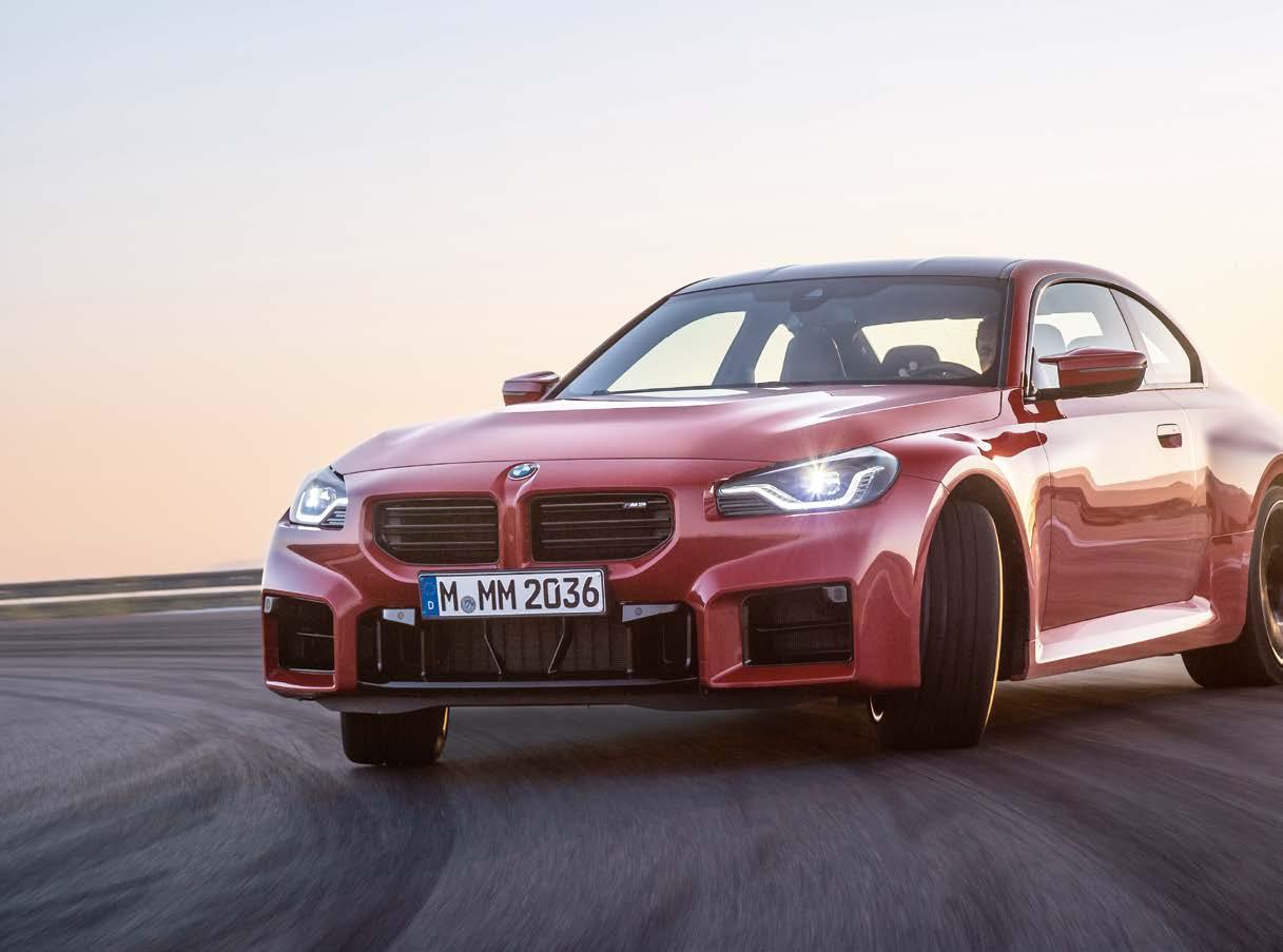 BMW M2. 338 kW (460 hk). Brændstofforbrug ved blandet kørsel WLTP 10,2 - 9,6 l/100 km. CO2 udledning ved blandet kørsel 230-218 g/km. Forbruget kan påvirkes af kørestil, tærren, vejrforhold samt tilvalgt ekstraudstyr. Bilen er vist med ekstraudstyr. BMW M2 lanceres april 2023. Der tages forbehold for trykfejl og prisjusteringer