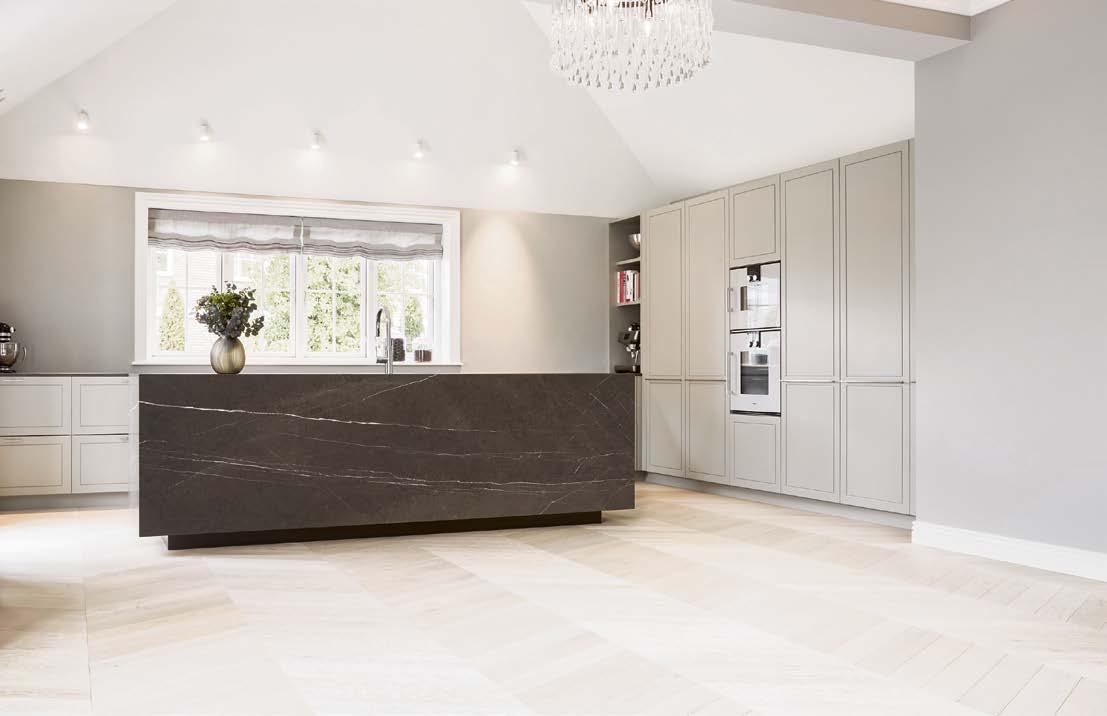 inspireret af sand, strand og hav. Den grå køkkenø har bordplade i hvid, matslebet quartzite med grønlige nuancer, og den håndsmedede vask er i massiv messing, der med tiden vil patinere smukt. Quartzite er en natursten, hvis årestruktur minder om marmor, men har styrken fra granit – derfor er den modstandsdygtig overfor ridser og syrer fra fx citroner og eddike.