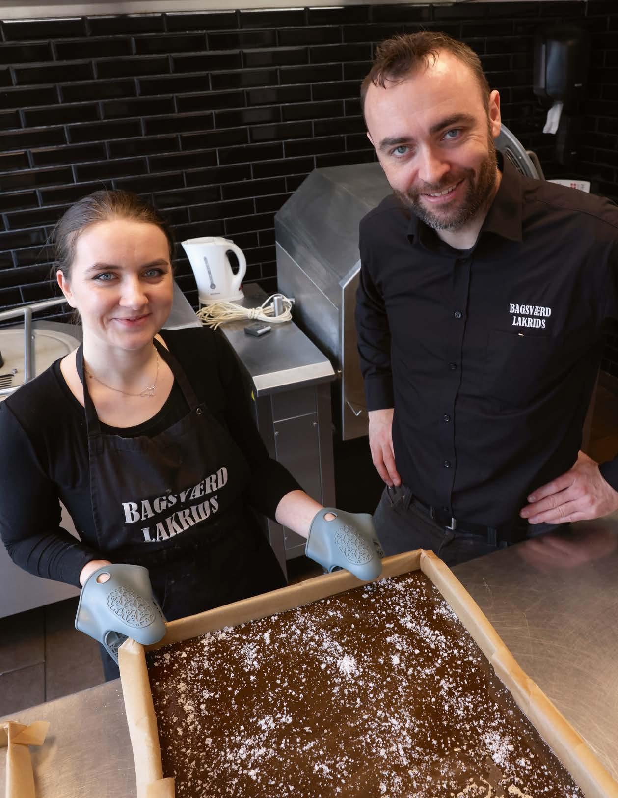 Direktør og medgrundlægger af Bagsværd Lakrids, Morten Kornbech Larsen (th.) og lakridsmager Kateryna Rusnak fra Ukraine (tv.) står med saltlakridsen med læsøsaltet.