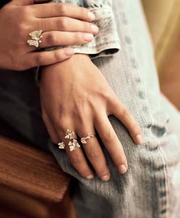 To eventyrlige Fairytales-ringe fra Christine Hvelplund, hvor små sommerfugle er klar til at flyve ud i foråret. Til venstre Dancing Butterfly i 18 kt guld med 141 funklende brillanter (i alt 0,50 ct) til 42.300 kr. Til højre Siblings i 18 kt guld med 28 brillanter (i alt 016 ct)