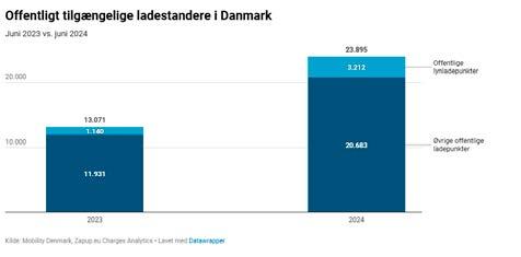 Hvor der ved begyndelsen af sommerferien sidste år var godt 13.000 offentligt tilgængelige ladepunkter i Danmark, er antallet siden vokset til 23.895. Det betyder, at der er næsten 11.000 flere steder i landet, hvor elbilen kan oplades, hvilket svarer til en stigning på 83 procent. Samtidig er antallet af lynladepunkter vokset til 3.212, hvilket svarer til en markant stigning på 182 procent sammenlignet med sidste år.