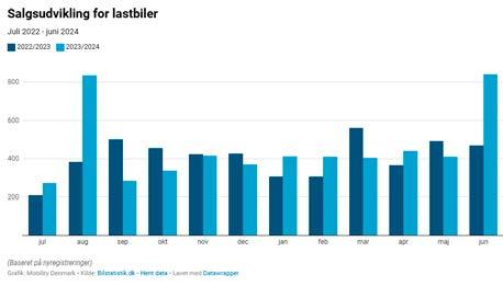 salget. Selvom der har været tilbagegang i enkelte måneder, er antallet af nyregistrerede lastbiler steget med 16,5 procent sammenlignet med første halvdel af 2023. Juni måned var den bedste salgsmåned i mere end 10 år, da der blev indregistreret 842 nye lastbiler. Det er en stigning på 79,1 procent sammenlignet med juni 2023.